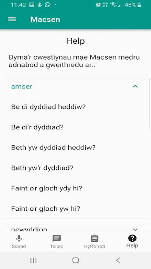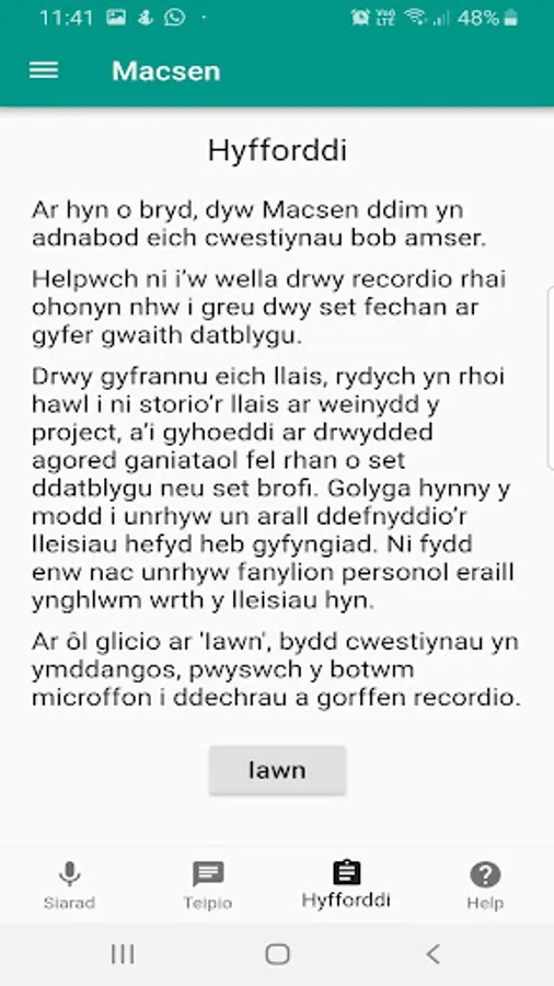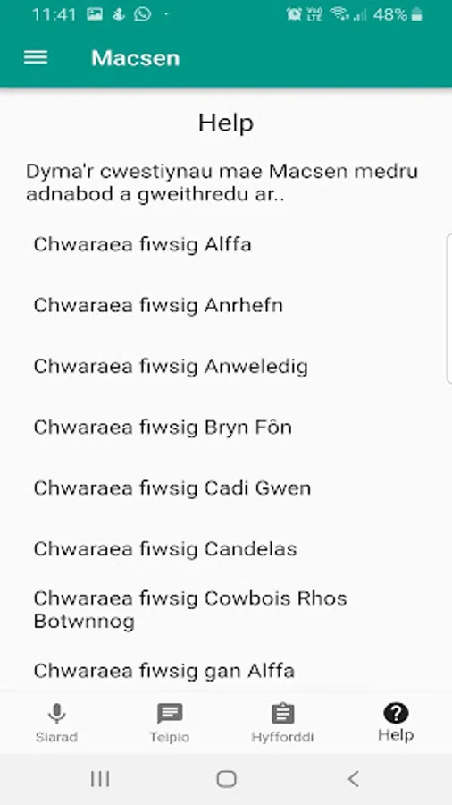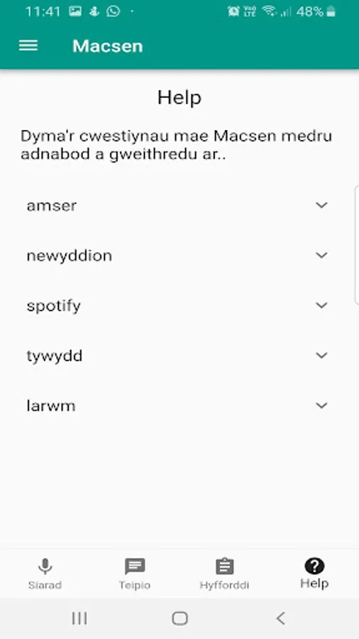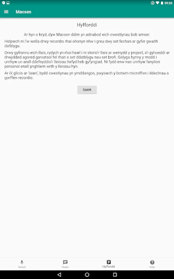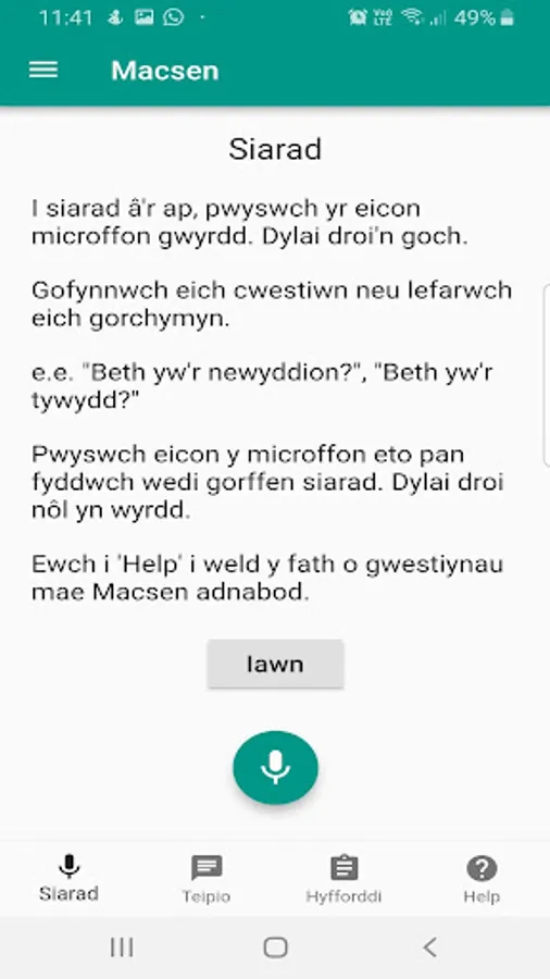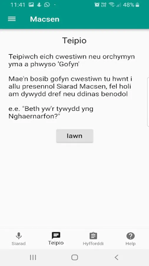 Macsen is a Welsh language voice assistant for your Android device. You can use voice commands or spoken questions to play music by Welsh artists on your Spotify app, hear the latest news from Welsh language news providers (Golwg360), ask questions from Wicipedia, play certain television programs on S4C Clic or simply set an alarm, and ask for the time or weather. : Mae Macsen yn gynorthwyydd lleferydd Cymraeg ar gyfer eich dyfais Android. Gallwch roi gorchmynion neu ofyn cwestiynau ar lafar er mwyn chwarae cerddoriaeth Gymraeg ar eich ap Spotify, clywed y newyddion diweddaraf gan ddarparwyr newyddion Cymraeg (Golwg360), gofyn cwestiynau i Wicipedia, chwarae rhai rhaglenni teledu ar S4C Clic neu yn syml osod larwm, a gofyn am yr amser neu'r tywydd.
