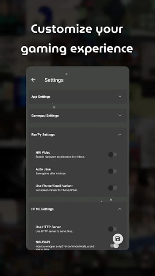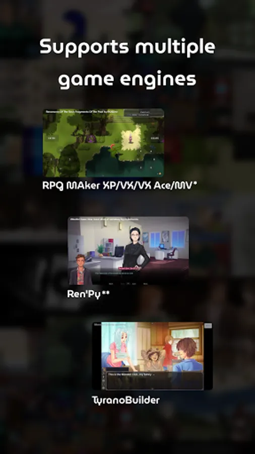 JoiPlay is a game interpreter and launcher for RPG Maker XP/VX/VX Ace/MV*, Ren'Py**, TyranoBuilder and HTML based games.