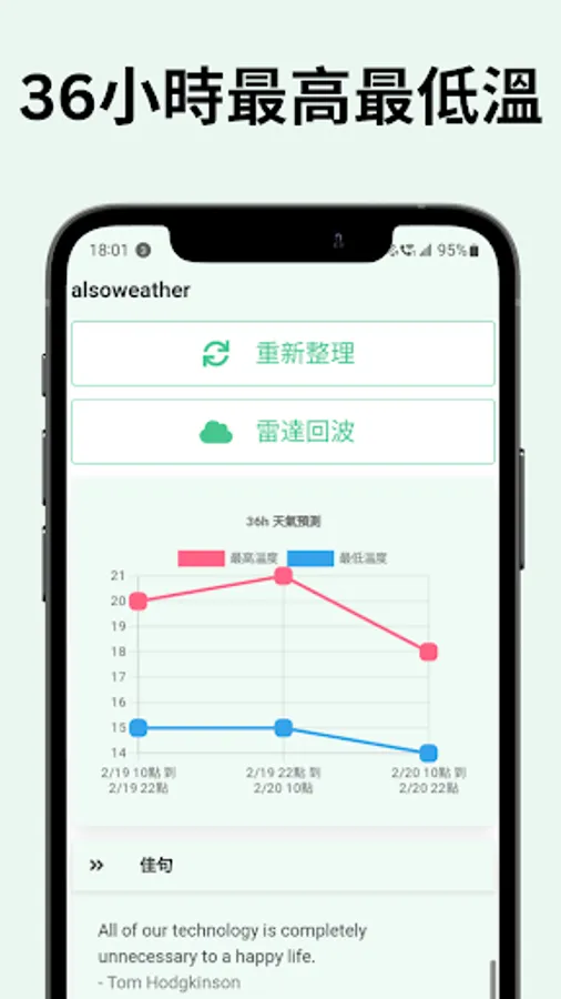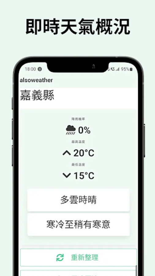 Alsoweather is an intuitive and user-friendly weather app that provides real-time weather forecasts for Taiwan. With this app, you can get detailed weather information at a glance, including temperature, PoP and more. You can also check the weather forecast for the next few days and stay updated on the latest weather conditions. The app also features a radar map that shows the current weather conditions in Taiwan. Get the most accurate and up-to-date weather information with Alsoweather!