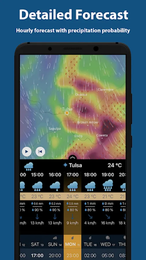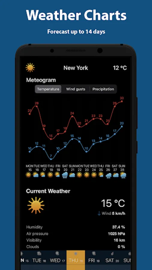 Weather forecast for the first three days is available in the app in one-hour steps. For other days, it’s available in three-hour steps. Users can also look up sunrise and sunrise times in a given place.
