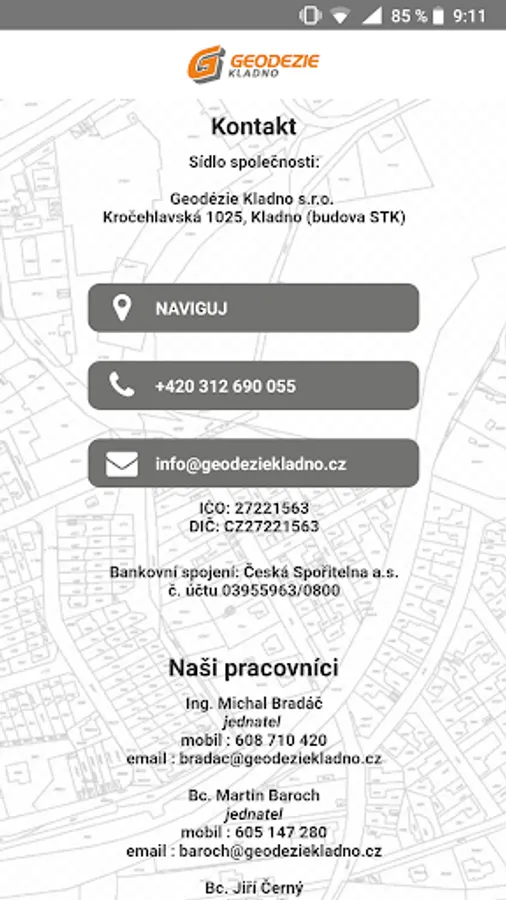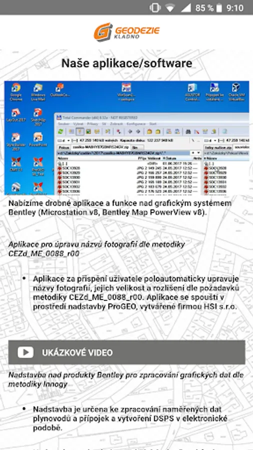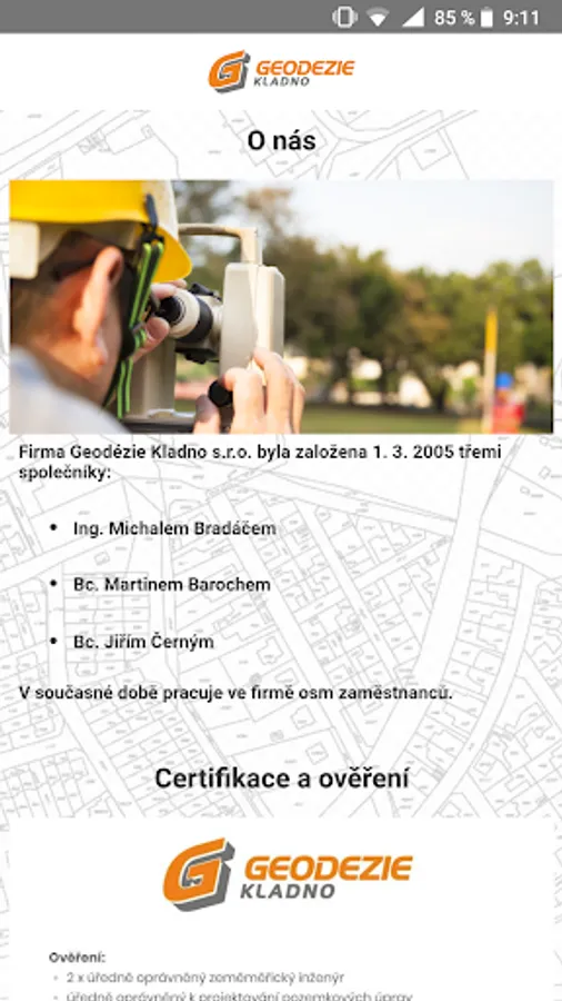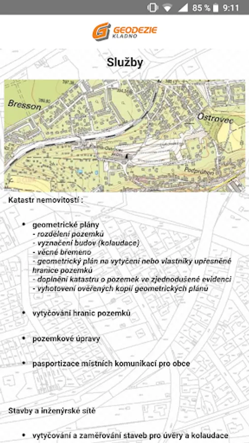 Prostřednictvím naší mobilní aplikace Vám přinášíme informace o našich službách. Provádíme geodetické práce ve výstavbě a katastru. Nabízíme geometrické plány, vytyčování pozemků a staveb pro úvěry a kolaudace, pozemkové úpravy, zaměřování, vytyčování a vyhledávání inženýrských sítí, měření pomocí GPS, projektové zaměření, digitalizace map.