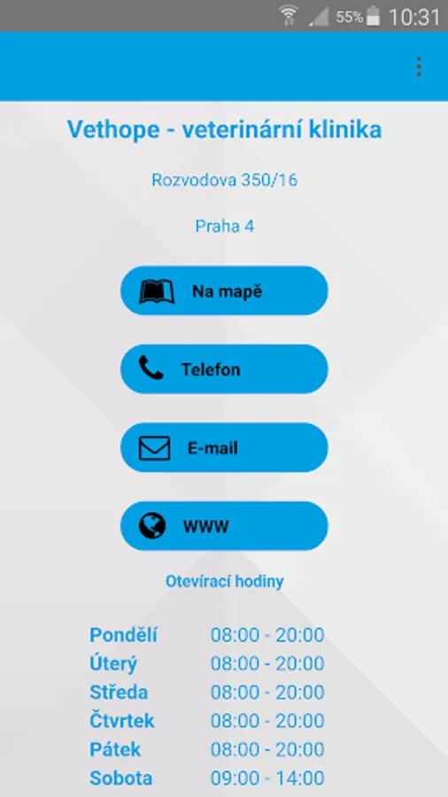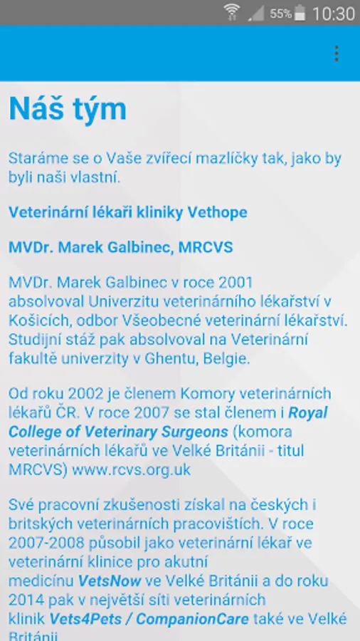 Vethope a veterinary clinic in Prague 4, which focuses on prevention and treatment of small pets, especially dogs, cats and other small mammals. Applications Vethope will always remind you when you have a pet of your order on preventive examination or vaccination. It also lets you chat live with our doctors, subscribe to the veterinary clinic or you immediately send a photo of your problem or injury to a pet for consultation.