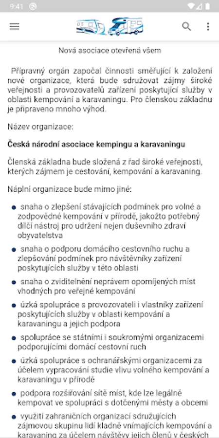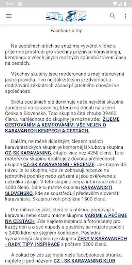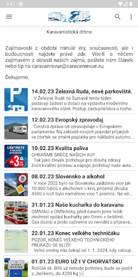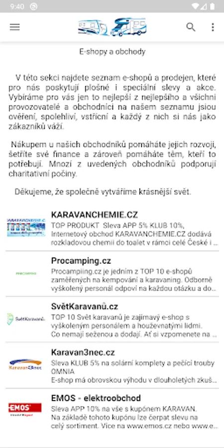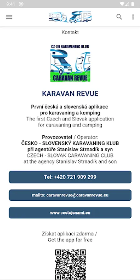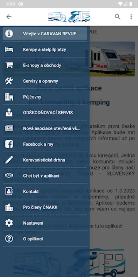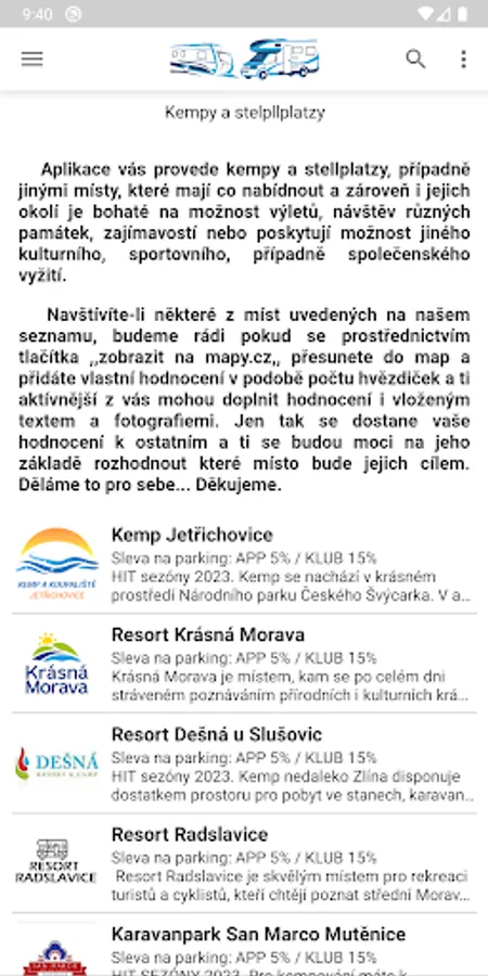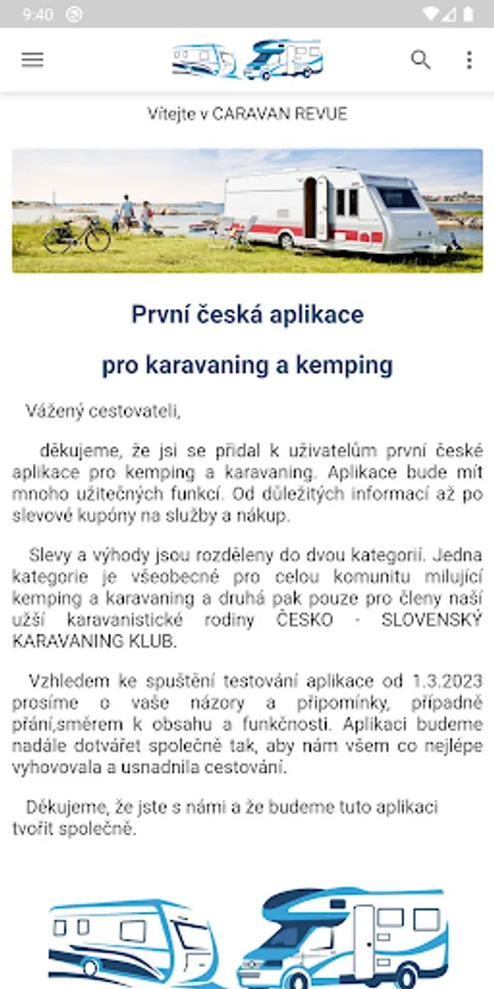 The first Czech and Slovak application intended for people who love camping and caravanning. In the application, you will learn about news, legislative changes, events, caravan gatherings, opportunities to use discounts on services, goods and accommodation or refueling with a discount within the framework of partner programs.