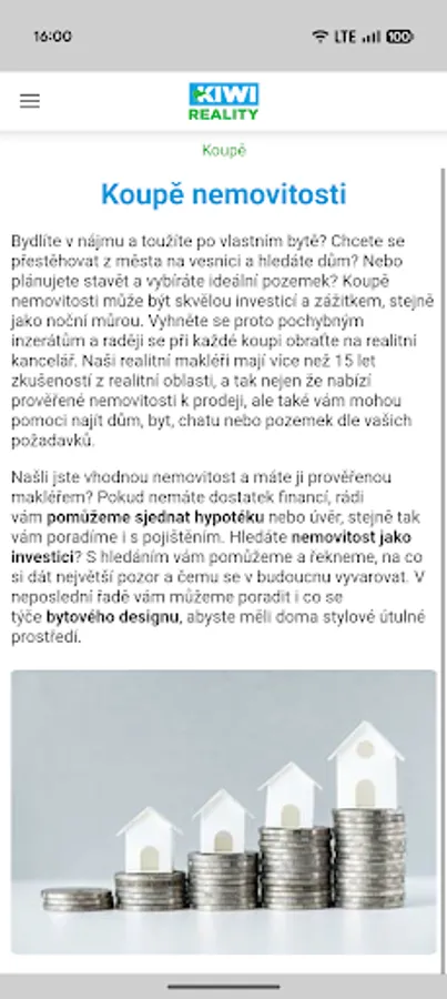 Discover the world of real estate quickly and easily with the official KIWI Reality app! As the leading real estate agency in the Czech Republic, we will help you save time and money when selling real estate, renting apartments and investing in real estate. Whether you are looking for a dream house in Ostrava or a lucrative opportunity in Brno – our app will make it easier.