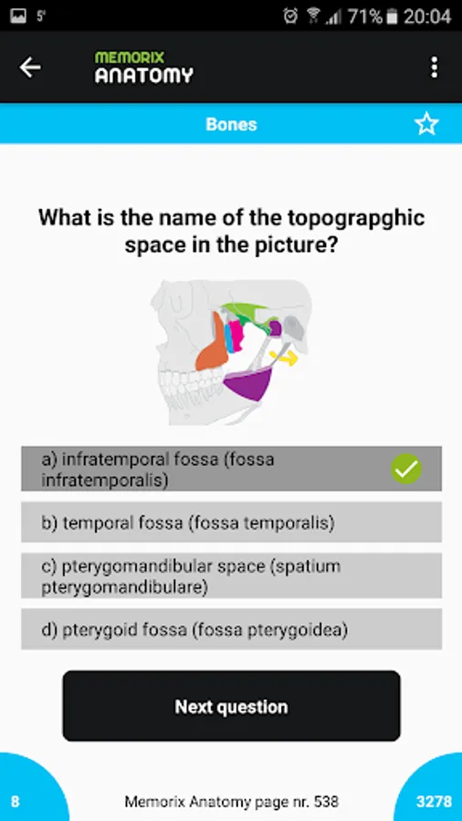 Learn anatomy by answering thousands of questions focused on general, special and topographic anatomy. Users may choose to study certain chapters (e.g. 2. The human skeleton) and subchapters (e.g. 2.2 The human skull, 2.2.2 Spaces in the skull). Or they may combine the chapters in any way. For revision we recommend to choose Practice, in which you may go through questions. The questions have a variety of forms, such as multiple choice answers, memory cards or figures. Our Premium version you may choose a extended version of Practice. This Premium version Practice includes, images from medical imaging methods (RTG, CT, MRI) with marked structures. For challengers, we have tests with a timer. When answering multiple choice questions and figures, the answers are written out and include not only the English term for a specific structure, but also its latin synonym.