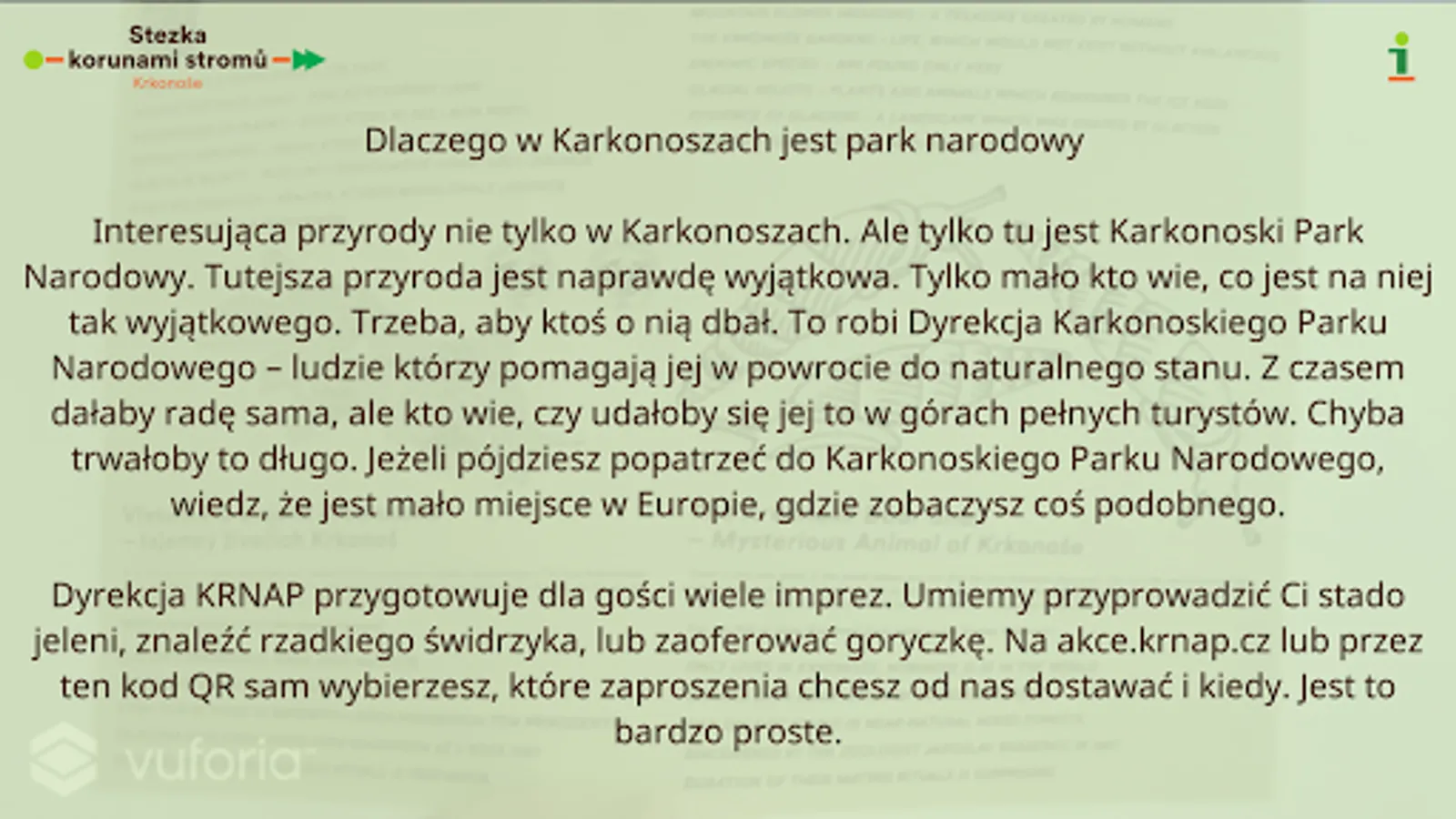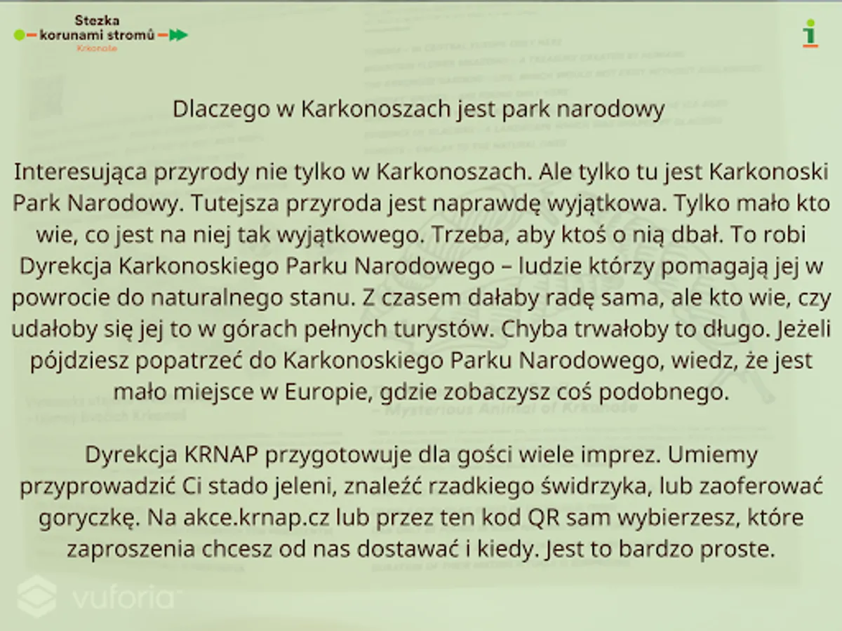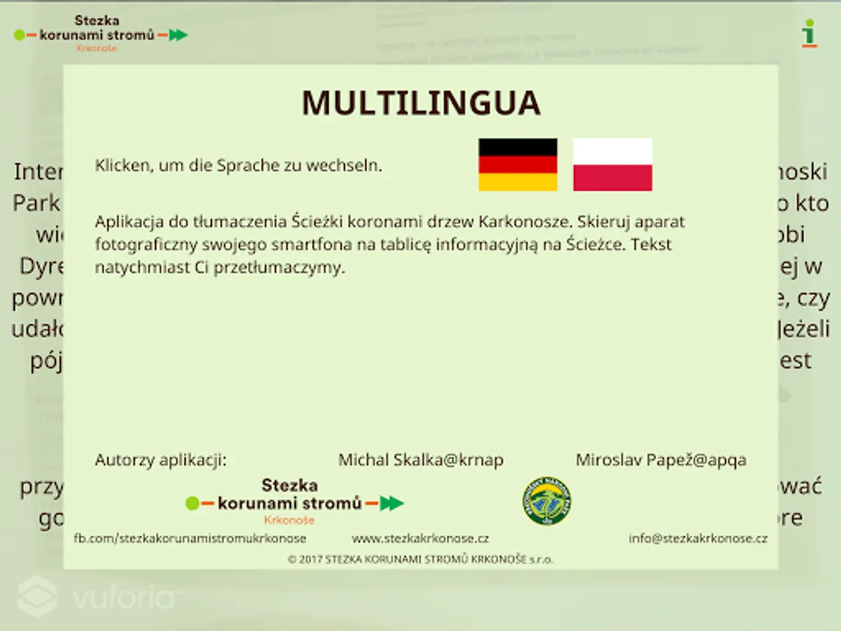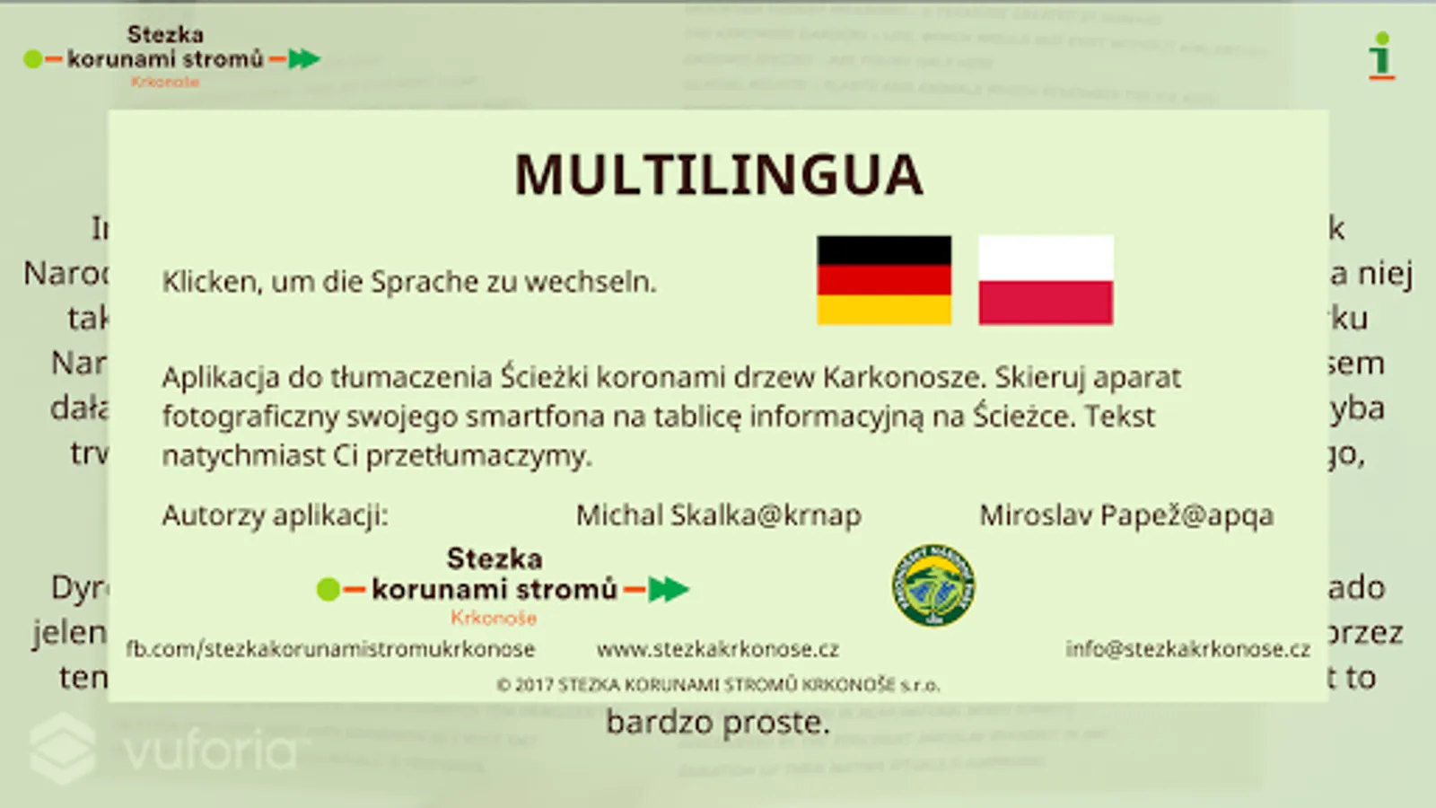The text translation applications Treetop Walkway Krkonoše. Point your smartphone's camera on the information sign Paths of the Krkonoše trees. The translation of the texts will appear immediately. Currently supports DE, PL.