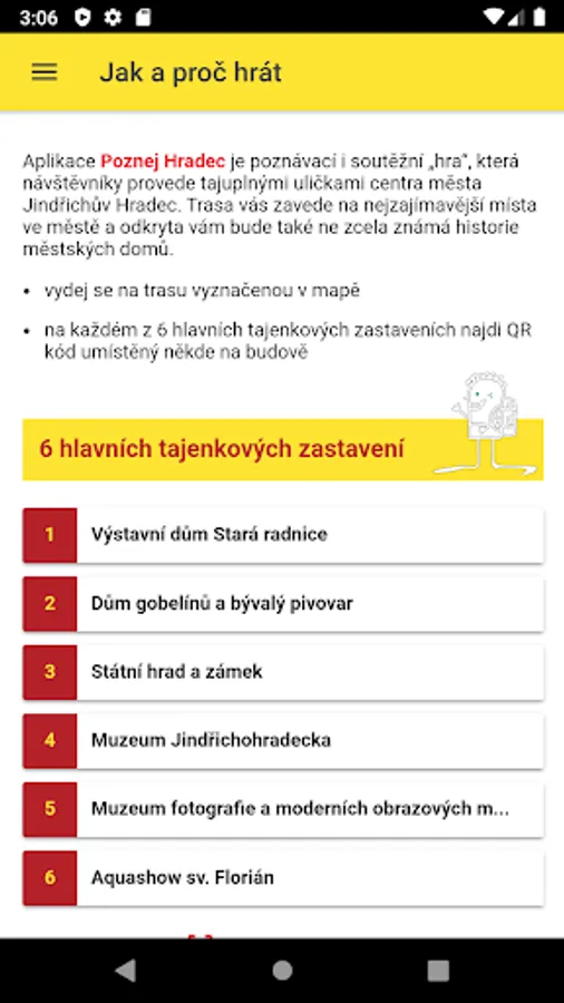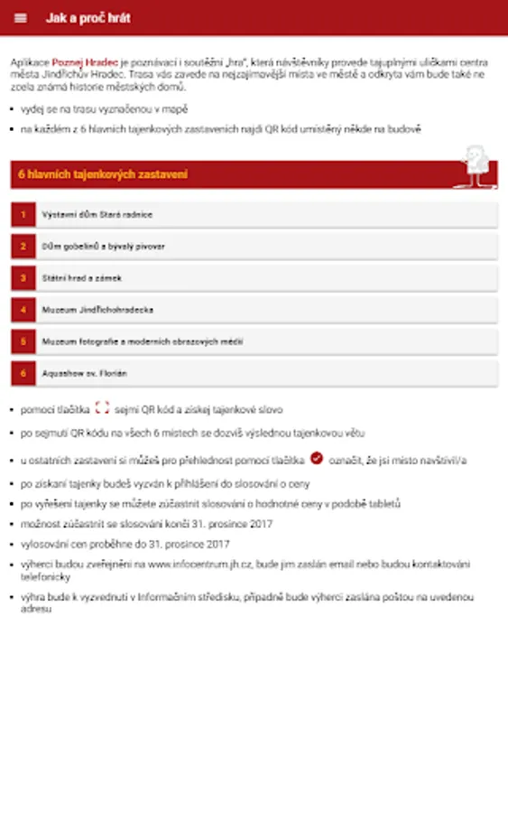 The Poznej Hradec application is an educational and competitive "game" that guides visitors through the mysterious streets of the center of Jindřichův Hradec. The route will take you to the most interesting places in the city and you will also be exposed to the not entirely known history of the town houses. By scanning QR codes, you will gradually reveal the words of the secret sentence. After solving the mystery, you can participate in a draw for valuable prizes in the form of tablets.