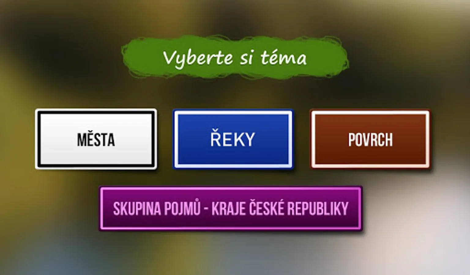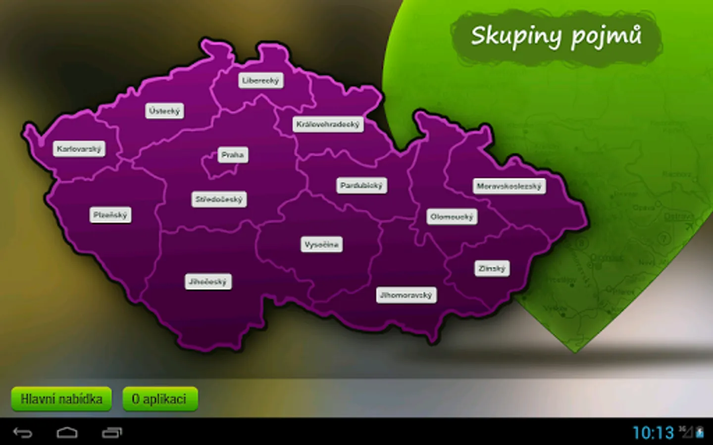 Geography of the Czech Republic for Android. Educational application that offers fun learning and practicing the surface of rivers, cities and regions of the Czech Republic. The surface of the river and the city of the students will practice in the map, where they immediately feedback, how many times have erred. Part of the application Kraje CR contains each kraji skupinu pairs of terms with the most important or the most attractive in the area. Pairs are color coded, so you can ultimately evaluate the whole region, respectively. add similar pairs.
