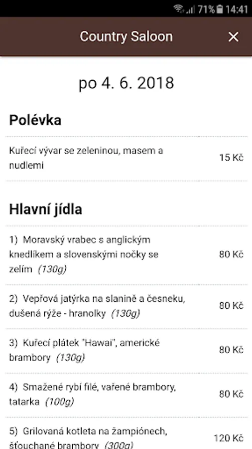 Look at the current daily menu restaurant Country Saloon in Jablonec nad Nisou