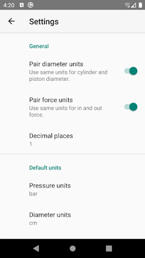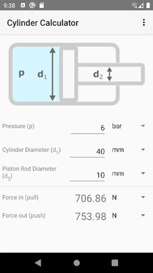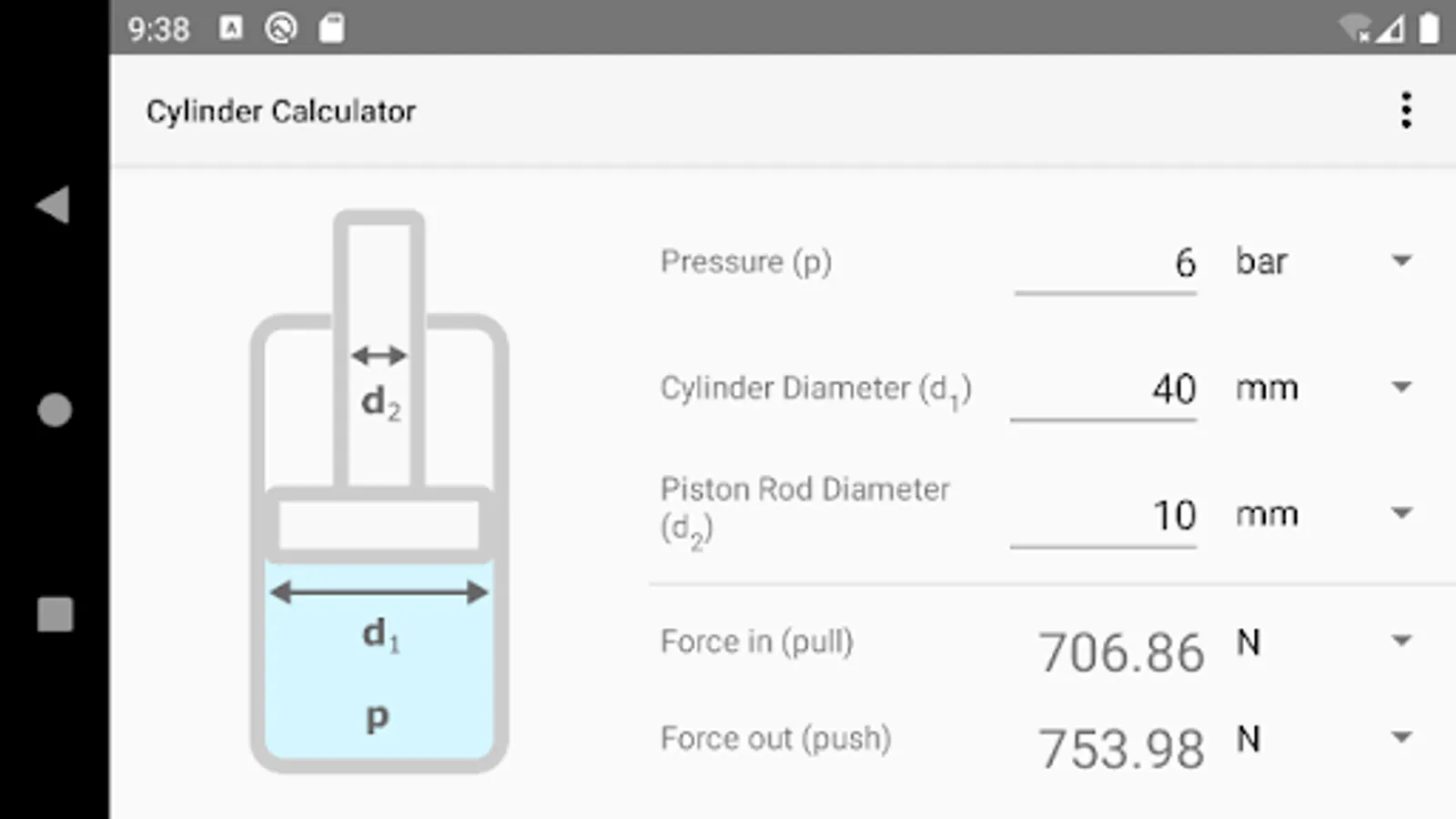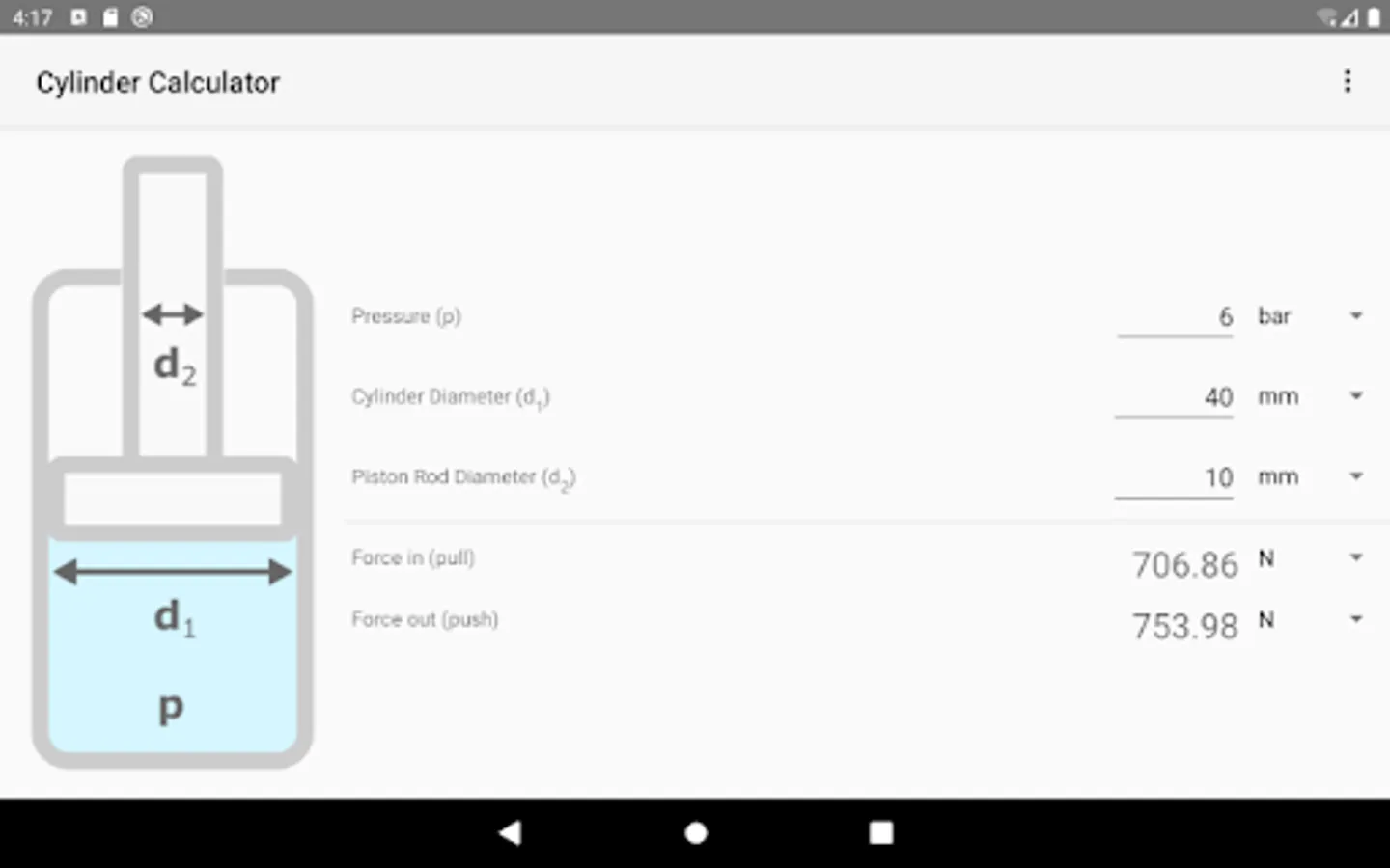 Applications for calculating force of a pneumatic cylinder. After inserting of input parameters the theoretical force for the movement in both directions is calculated. You can choose different types of units for the input parameters.