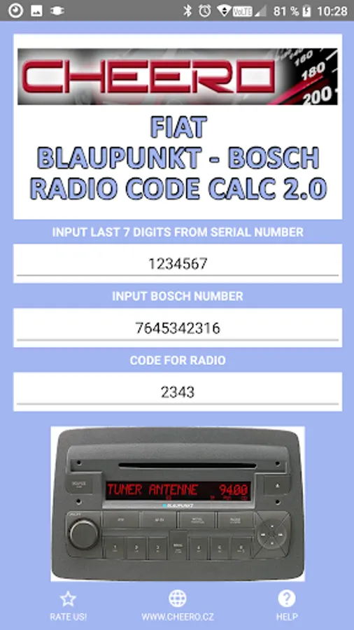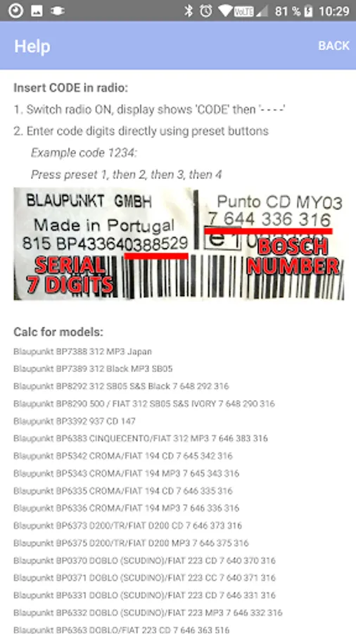 Calc for CODE radios FIAT BLAUPUNKT and BOSCH all models.