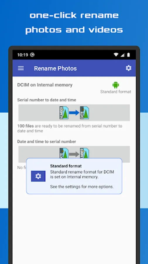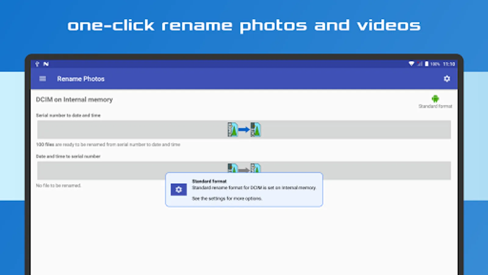 Rename Photos lets you quickly and easily rename photo and video titles by date taken. Renaming from serial number to date and time of acquisition and vice versa from date and time to serial number.