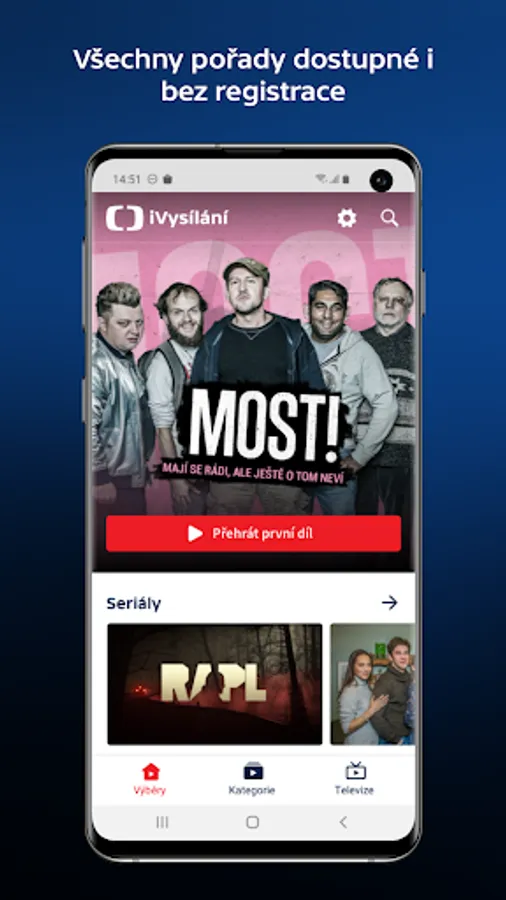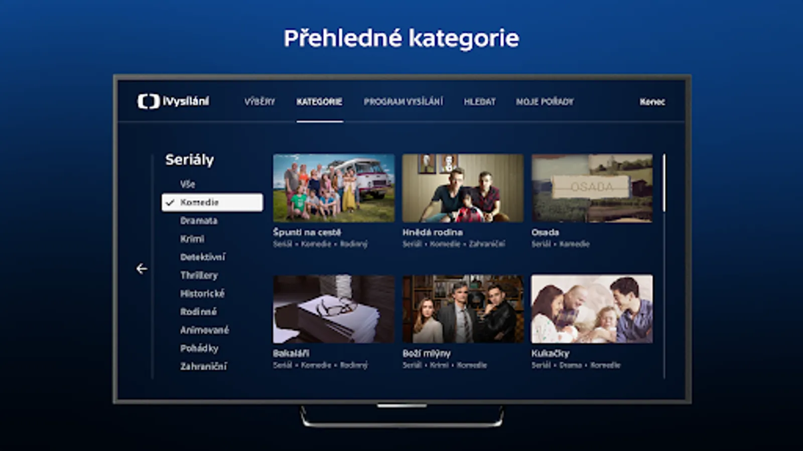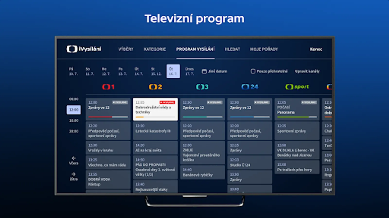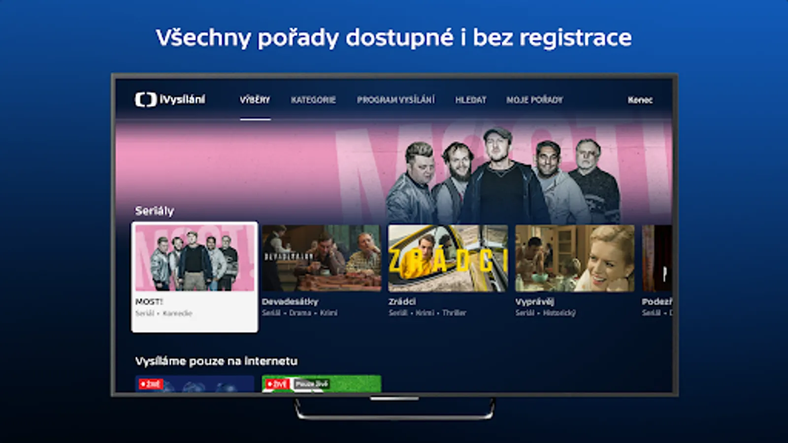 The official Czech Television iVyslíenie application for Android TV and Google TV offers a catalog of all available programs and Extra broadcasts. All available even without registration.