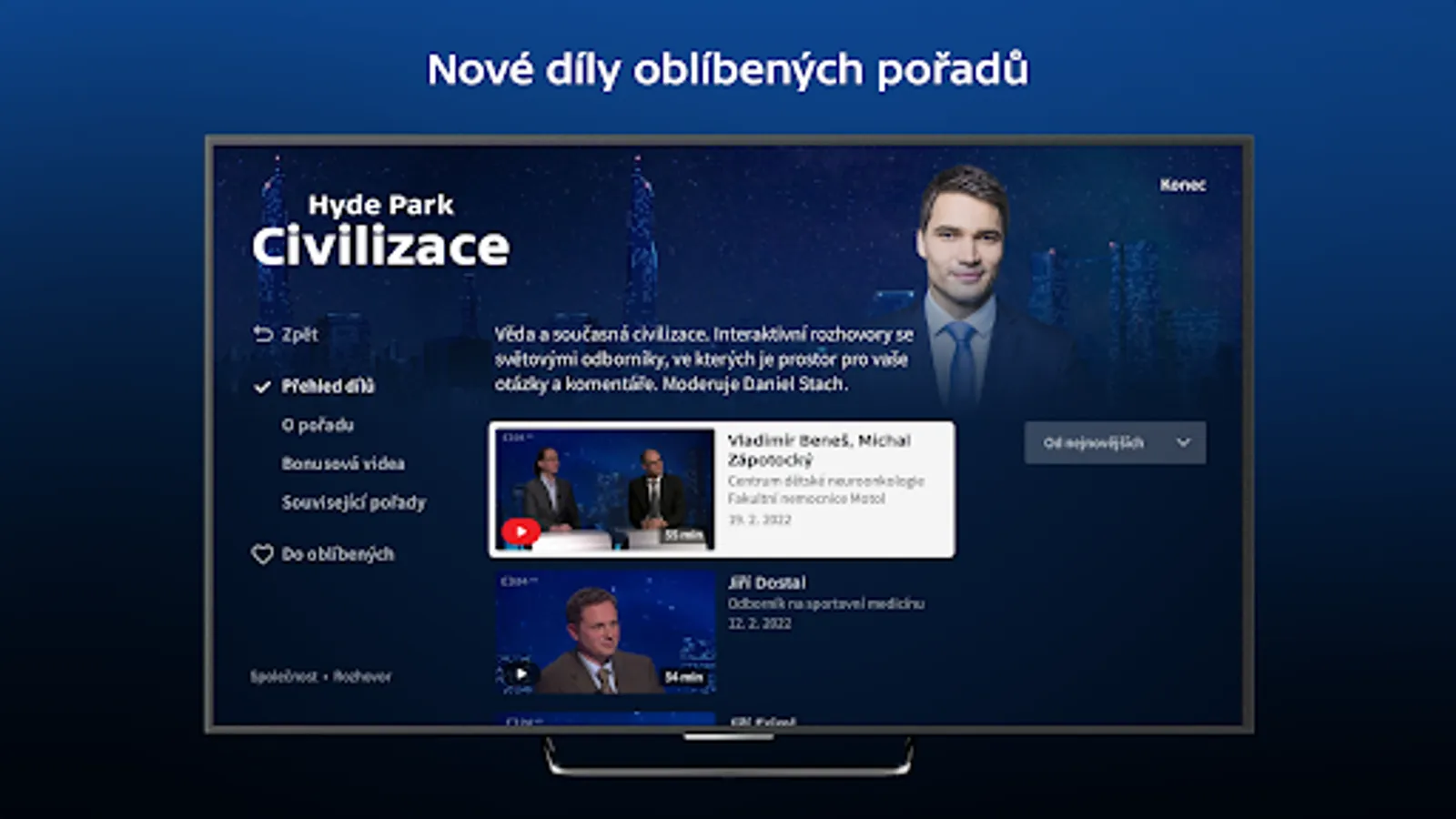 Television – You can also conveniently search the archive using the TV programs of individual channels of Czech Television (ČT1, ČT2, ČT24, ČT sport, ČT : D and ČT art) including all Extra broadcasts of iVysílání Plus and ČT sport Plus.