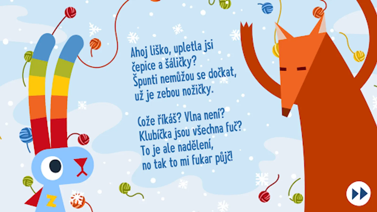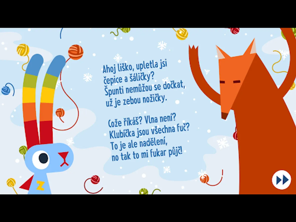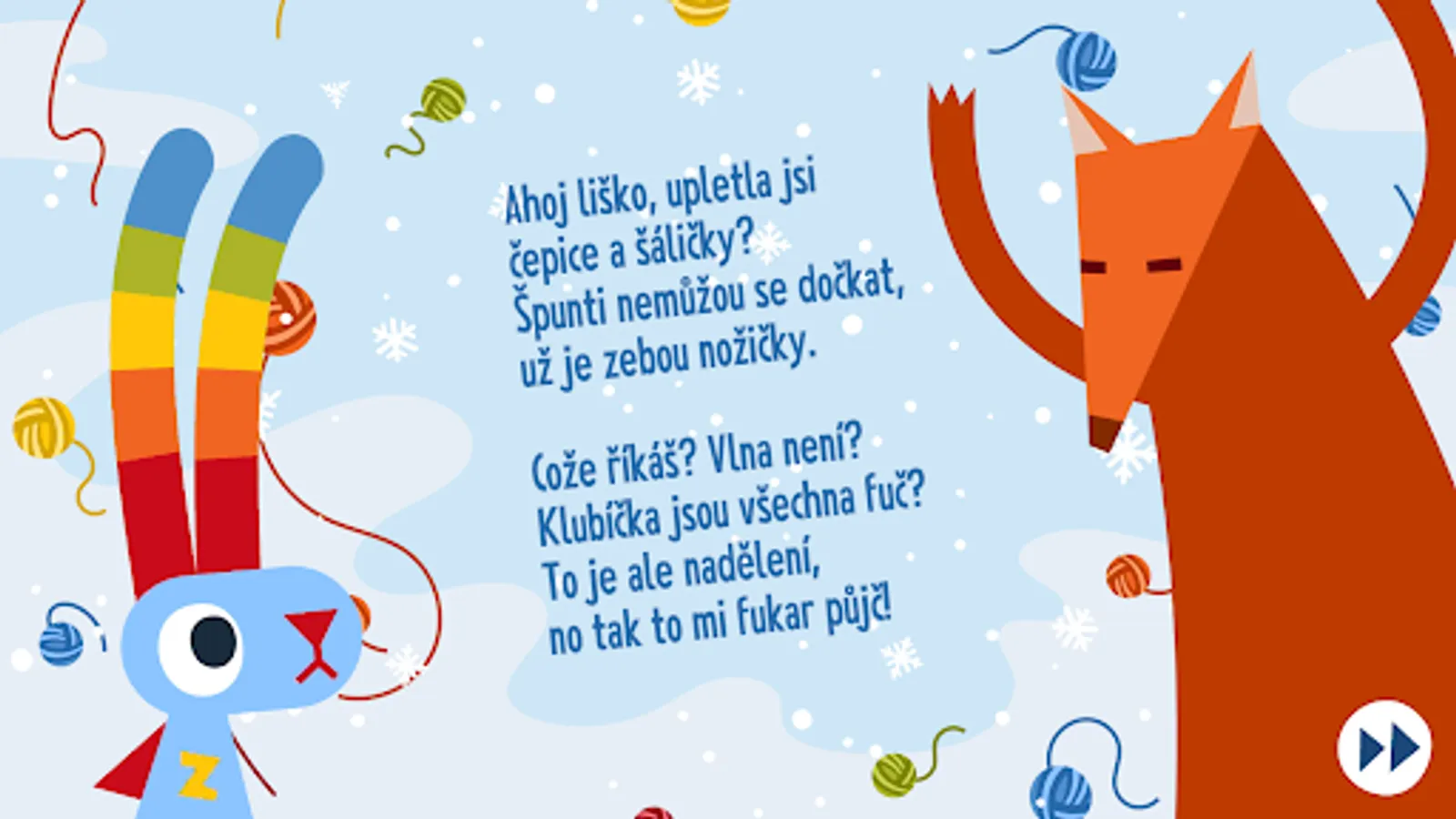 A harsh winter is coming, so the fox decided to knit scarves and hats for the Špunts so that they could survive it in good health and enjoy winter fun to the fullest. She had barely cast on a few stitches when she was startled by a strange sound and her little balls rolled out in all directions. Luckily, Zet was nearby and offered to collect the balls. It's no problem for him - he's a superhero!