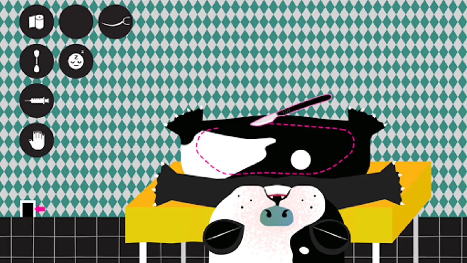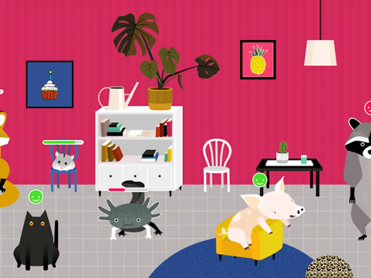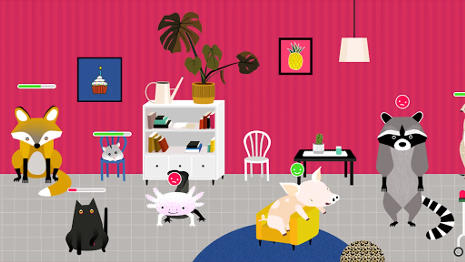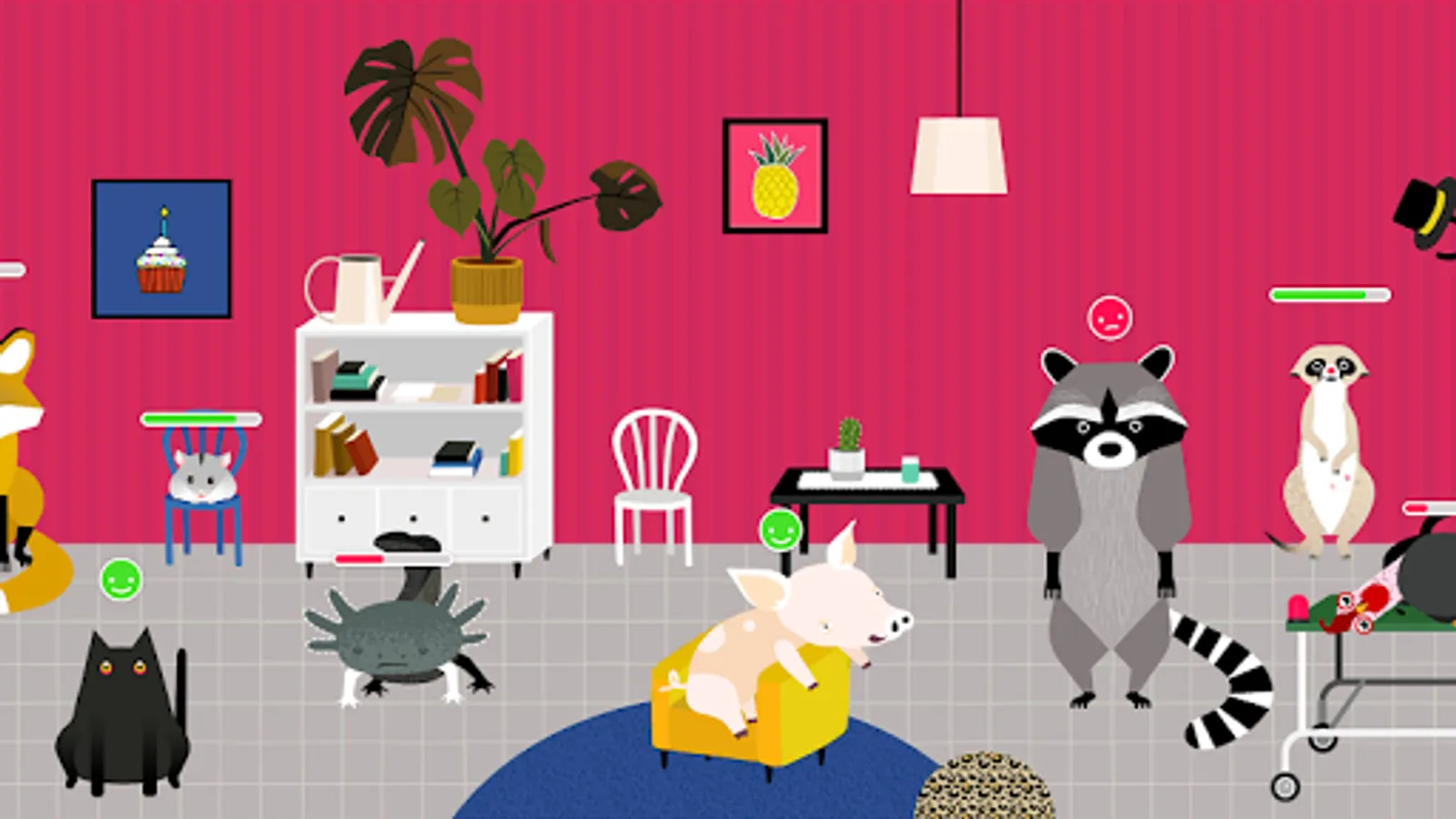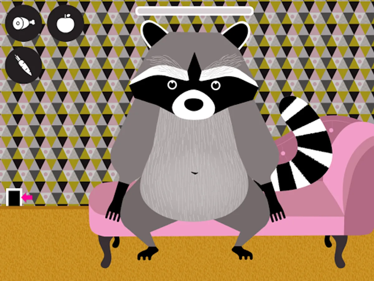 The raccoon, the pig, the dog and the other cute pets need to be treated and fed. What did the snake eat? And why is the raccoon frowning? Také care of the animals and when they are hungry, feed them again!