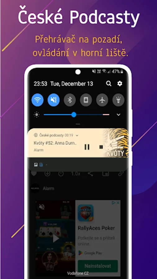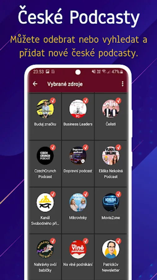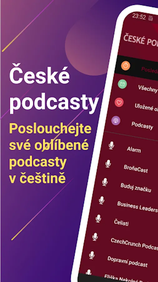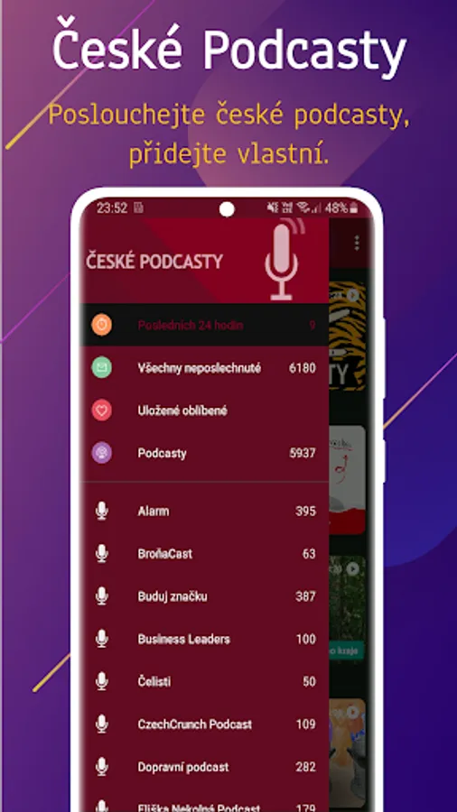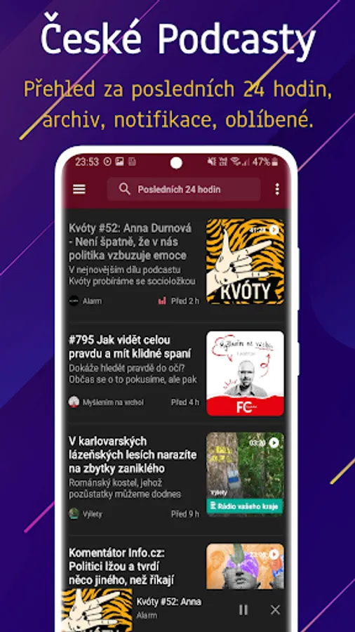 Listen to podcasts in honor. Application for listening to Czech podcasts and watching the latest episodes. Option to add your own podcasts. The application contains preset interesting podcast channels in Czech that you can change. Custom player in the background of the app.