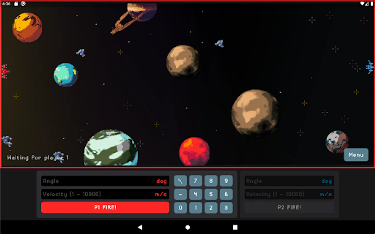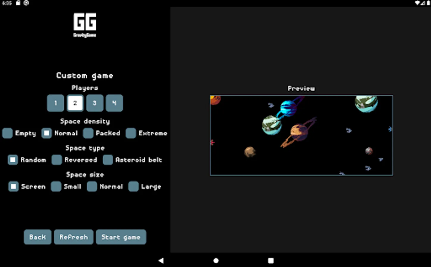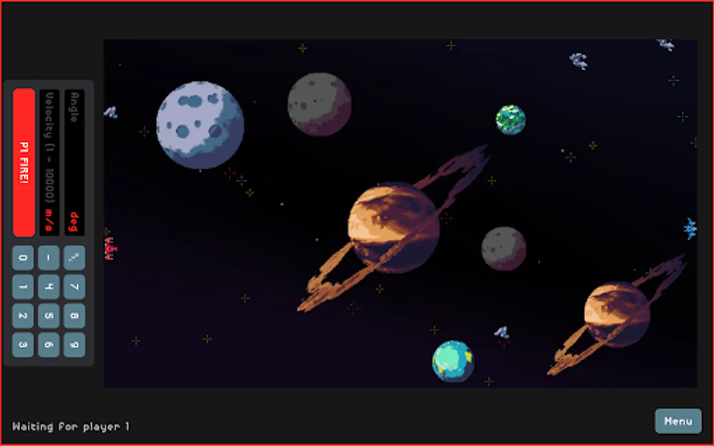 Gravity Game or GG for short is a game where 1 to 4 players are fighting against each other or an AI in universe filled with planets and asteroids. Each turn player inputs angle and velocity for his projectile to be fired between the gravity influencing planets and other players ships. The goal is to stay alive and eliminate all other players.