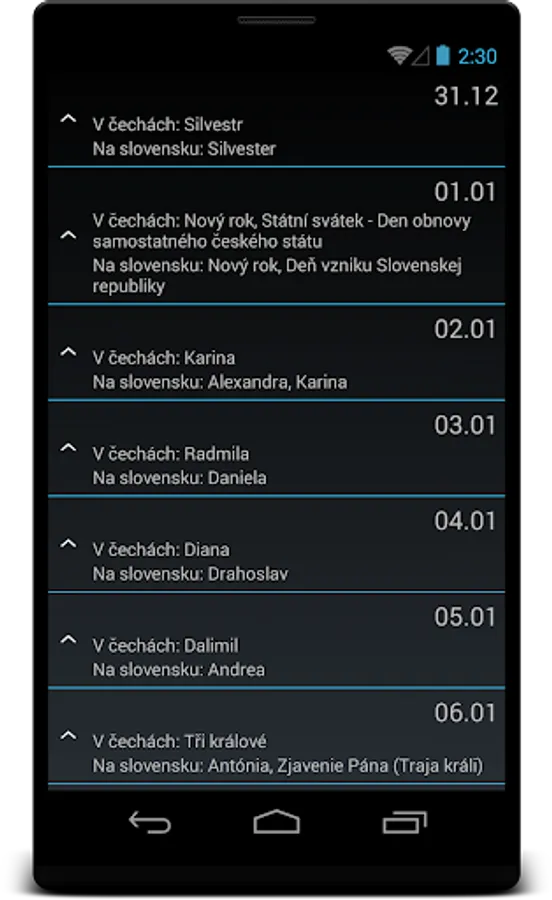 Android applications Holidays displays name day of your choice and birthdays for each day of the year from your list.