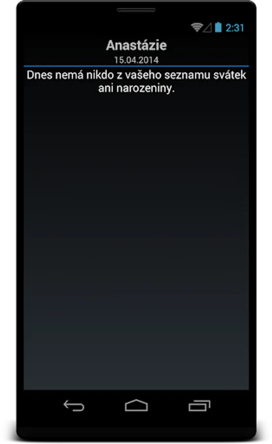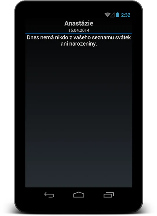 The Android Holidays app displays the name day of your choice and the birthday for each day of the year from your list.