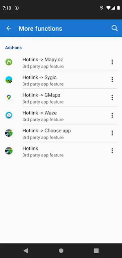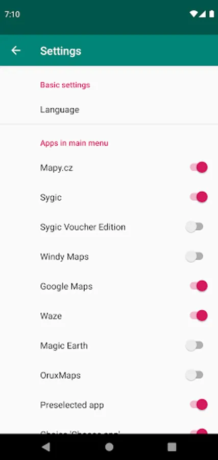 Supported apps are: Mapy.cz, Google Maps, Orux Maps, Sygic, Waze, WindyMaps, 'Pre-selected app' and chooser. The vehicle manufacturer's application can be preselected, e.g. Mercedes Me, etc.