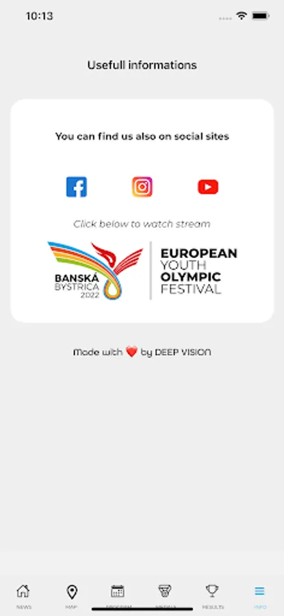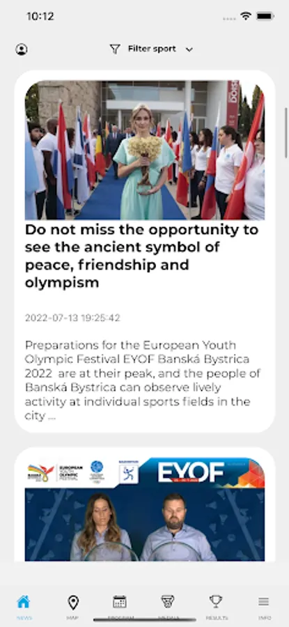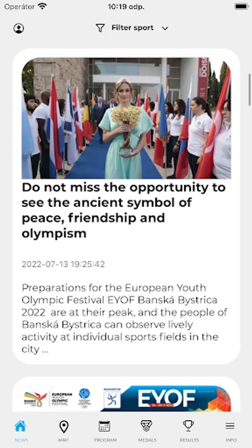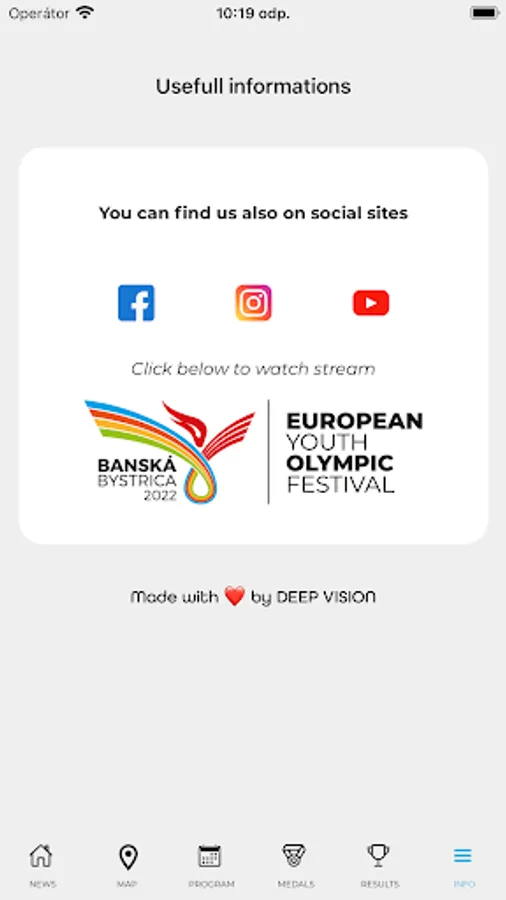 EYOF Banská Bystrica 2022 Mobile App is the official mobile application of the summer European Youth Olympic Festival 2022, which takes place between 24. and 30. July in Banská Bystrica, Slovakia.