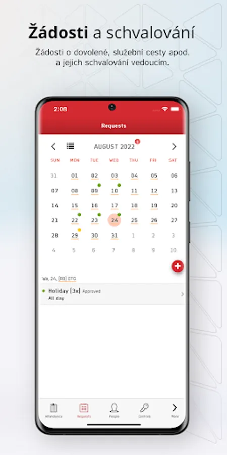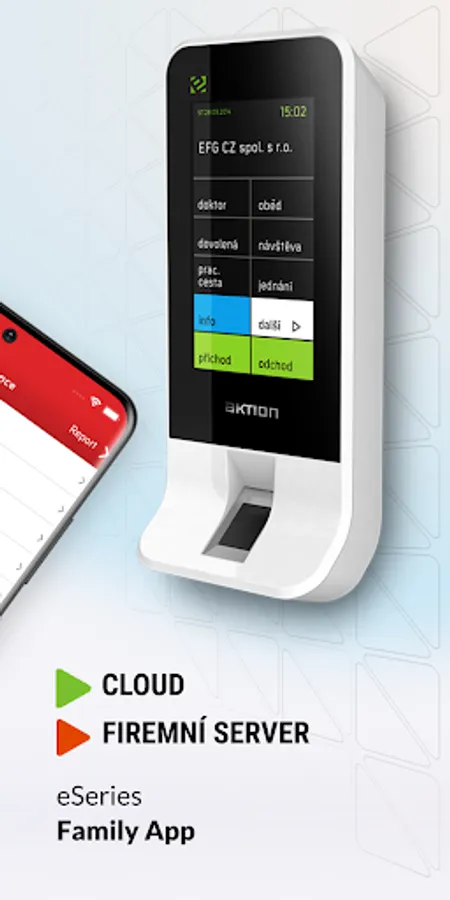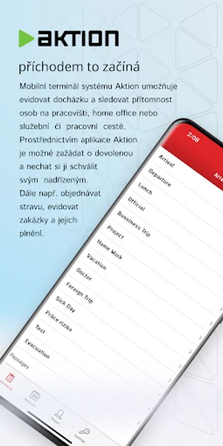 Mobile client to attendance and access system Aktion.NEXT. It makes easy recording working time to service technicians, salesmen and other employees who work outside the workplace where is impossible to use the regular attendance terminal on identification card. Allows you to open the front door of the building if the user forgets the card. It is also possible to remotely open the door or gate to expected visitors.