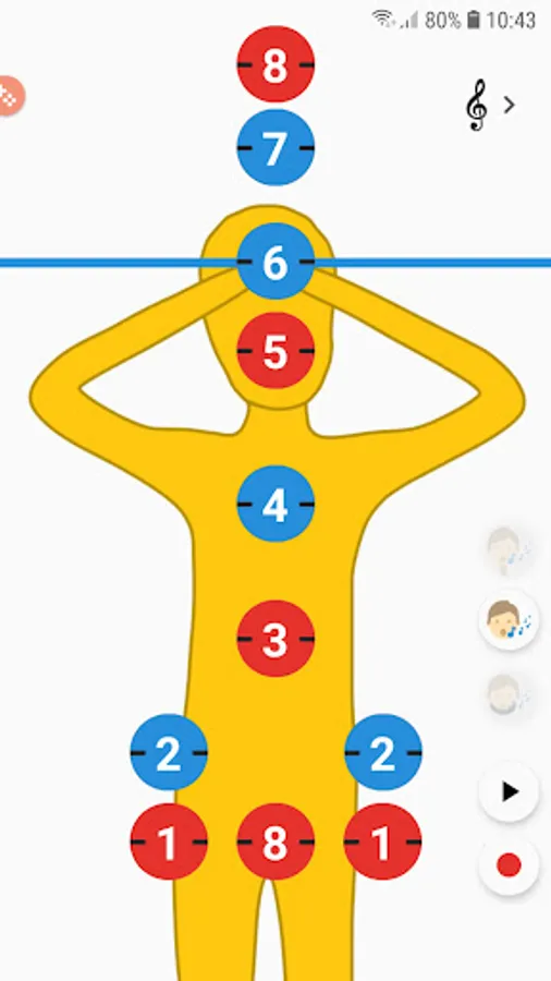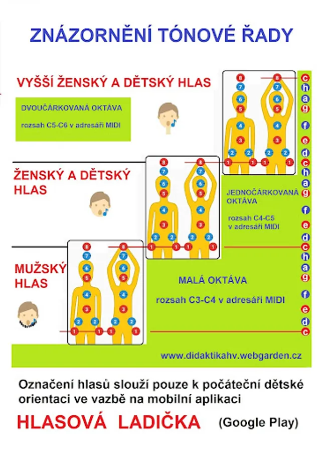 The tones are identified by a moving ruler, changing their color according to the height reached: the tones of the quinta-chord are red, the other tones are blue, the semitones are black. In addition, pitch is displayed by hand movements in sign language.