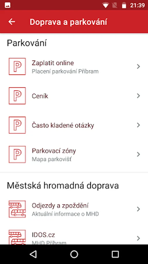• overview of public transport timetables, parking zones, parking lots and the possibility of payment of parking fees