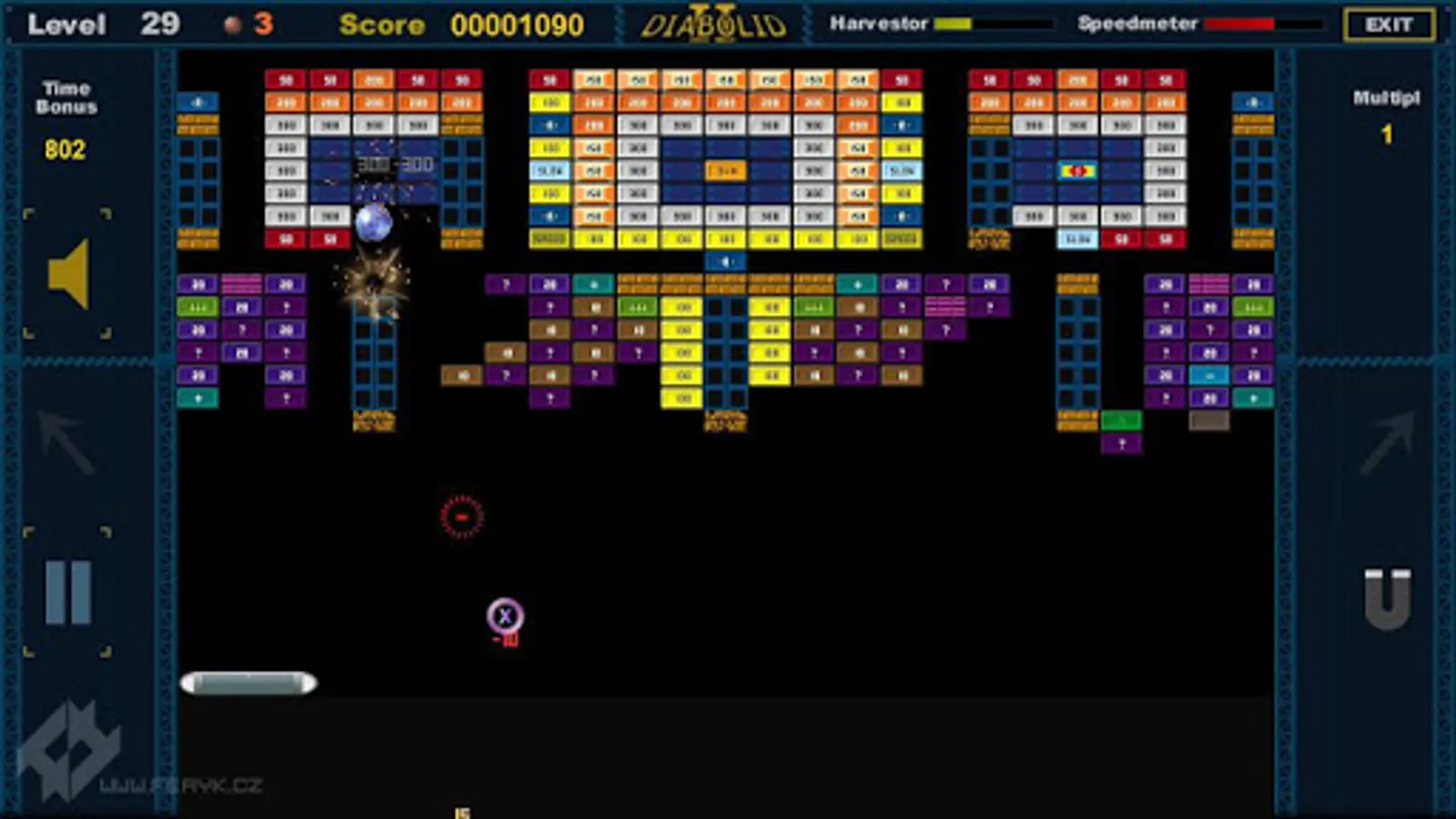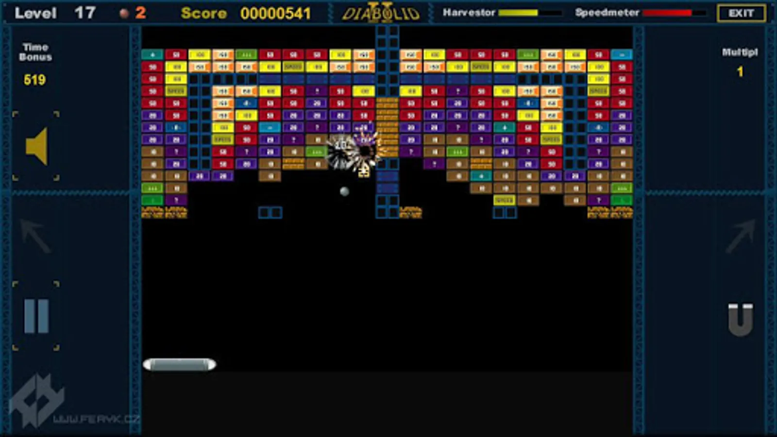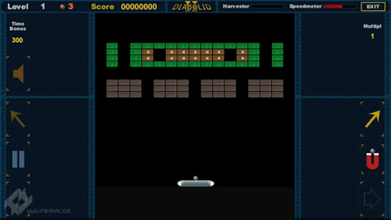 Diabolid II loosely follows my 2001 Diabolid game. This is a classic "brick break" game where you have to destroy all the pointed bricks in a given level in the shortest time. Higher levels bring higher ball speed, more bonuses and brick types, and a larger playing area. The game saves only one position and only when you collect the bonus in some levels. I will continue to improve the game.