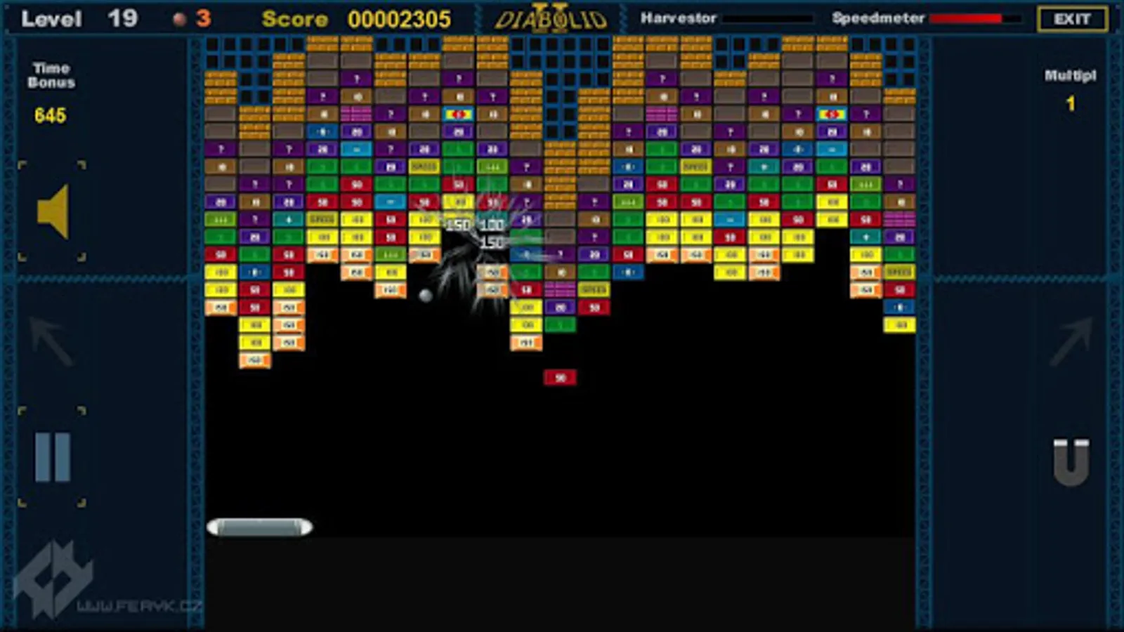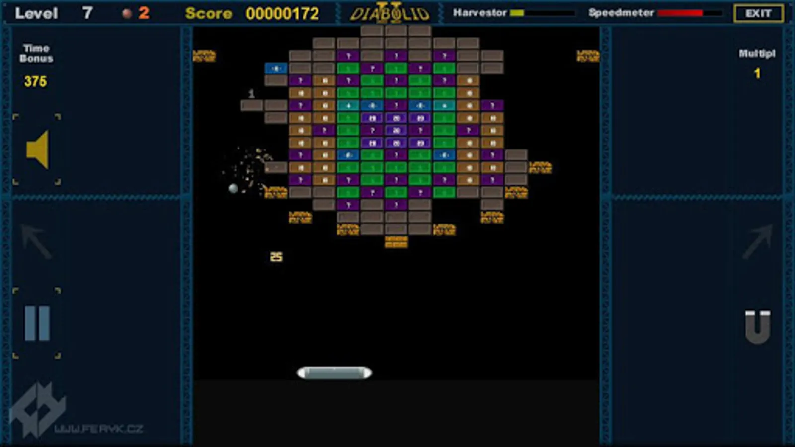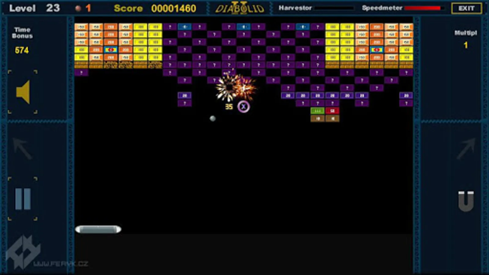 Diabolid II loosely follows my 2001 Diabolid game. This is a classic "brick break" game where you have to destroy all the pointed bricks in a given level in the shortest time. Higher levels bring higher ball speed, more bonuses and brick types, and a larger playing area. The game saves only one position and only when you collect the bonus in some levels. I will continue to improve the game.
