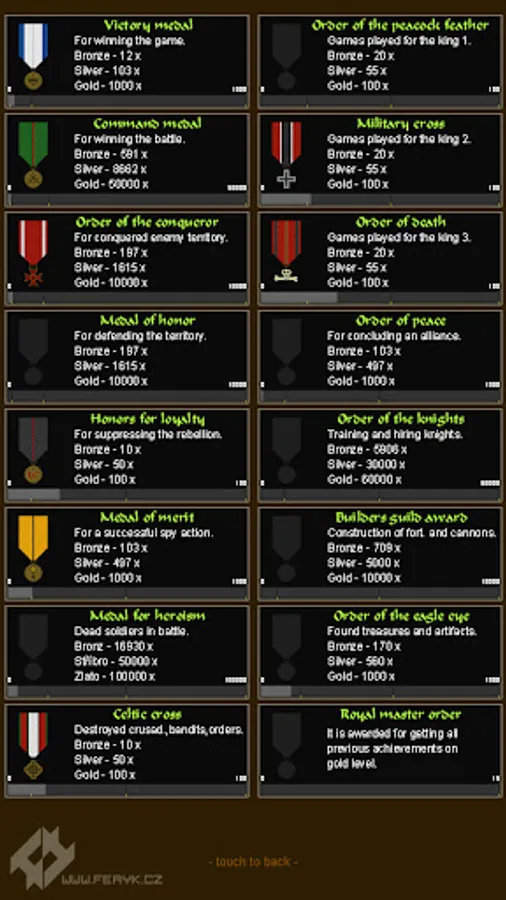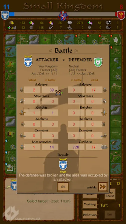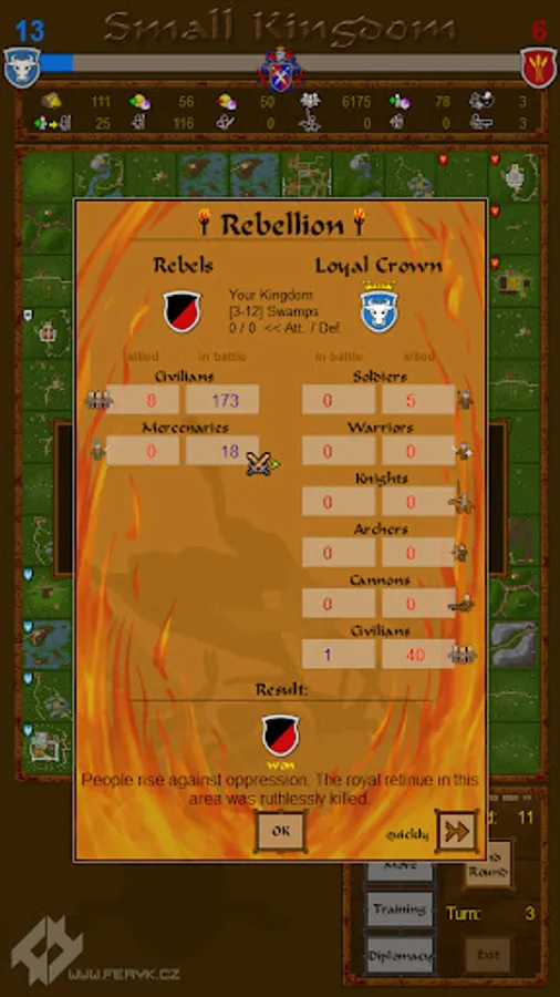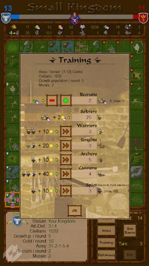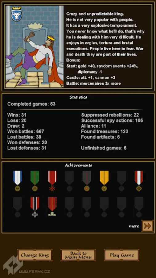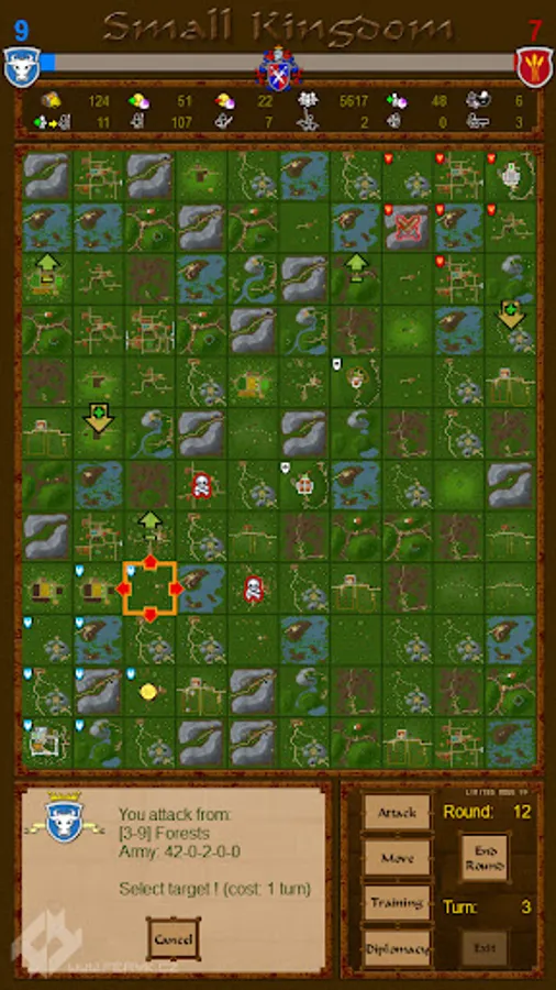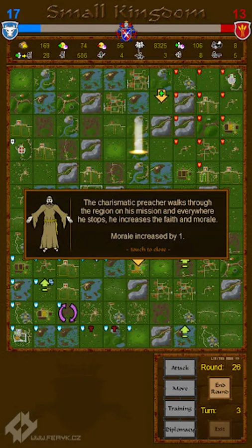 Expand your small kingdom. Recruit and train soldiers and spies. Improve your defenses and conquer territory on the map. A simple turn-based strategy that aims to train an army, conquer areas and destroy the enemy or gain more territory than him. You can choose from three kings. The game has minimal management requirements. There are achievements in the game, not yet connected to GPG. The game is still in development !