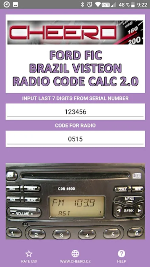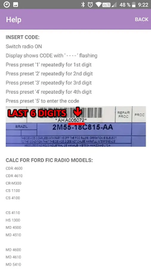 Calc for CODE radios FORD FIC BRAZIL VISTEON CDR4600 AND MORE.