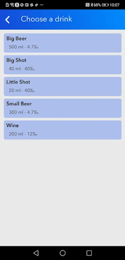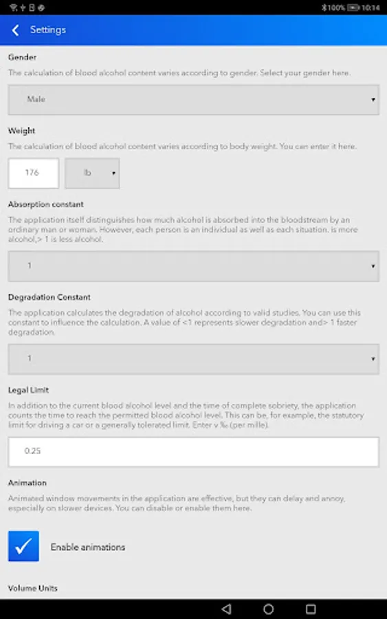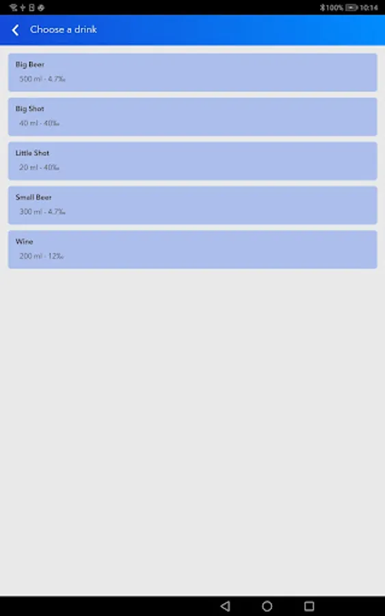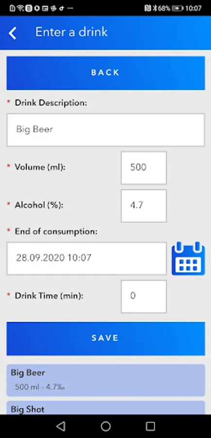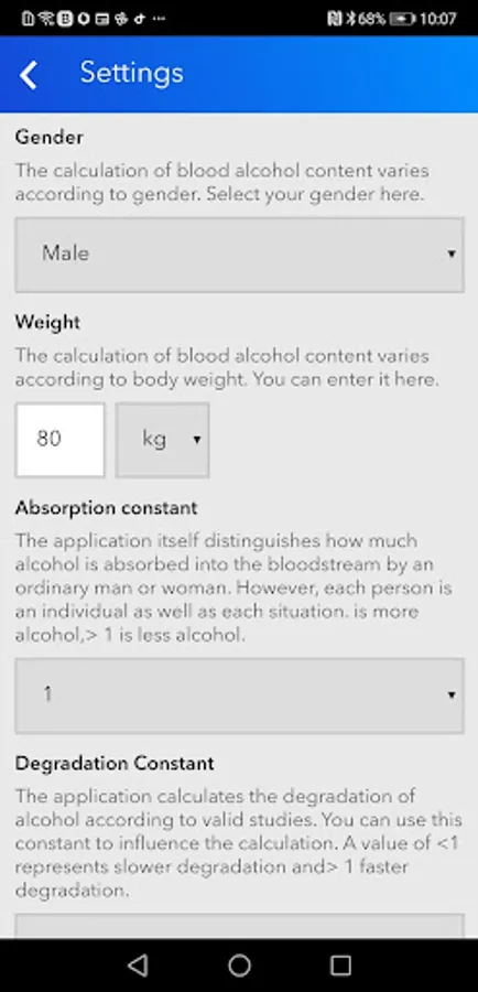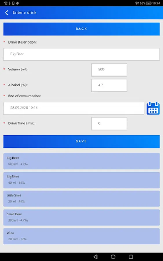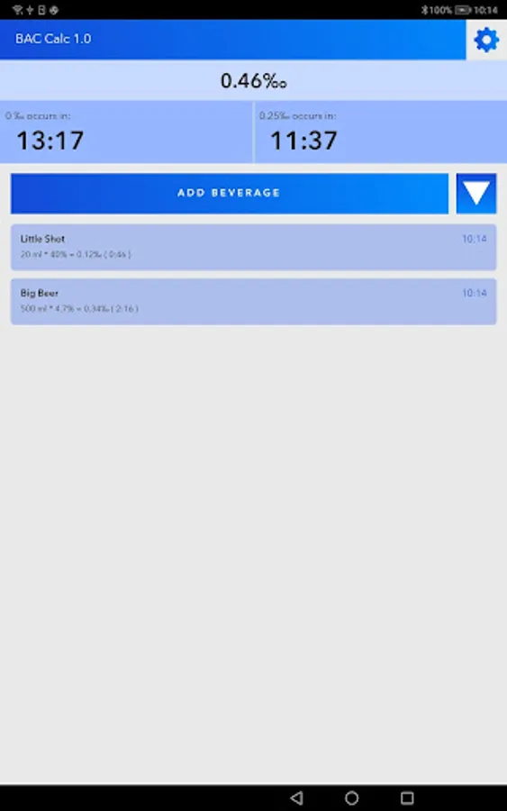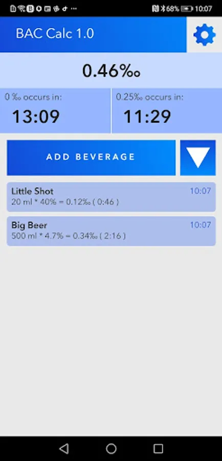 We are at a party or celebration and we need to make our consumption of alcohol subject to the need to leave by car. This application calculates the approximate blood alcohol content according to how we drink. First you need to set the gender and weight. Then just after drinking, we add a drink and the application calculates the current blood alcohol content and the estimated time of sobriety. It continuously updates this data so that the sobriety process can be monitored at any time.