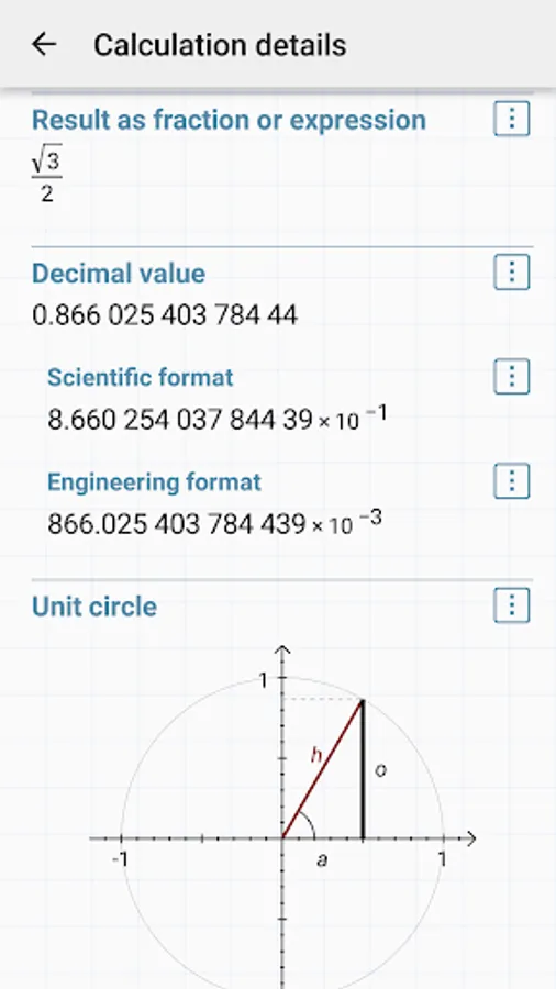- calculation details - extended information about a calculation like all complex roots, unit circle etc.;