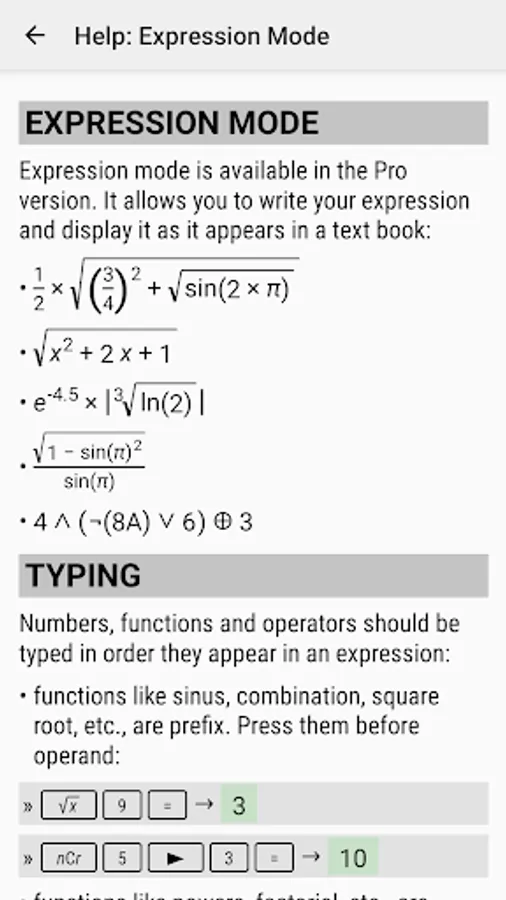 You can write expressions in a natural way and watch your calculations. The result is displayed as a number, simplified expression etc.