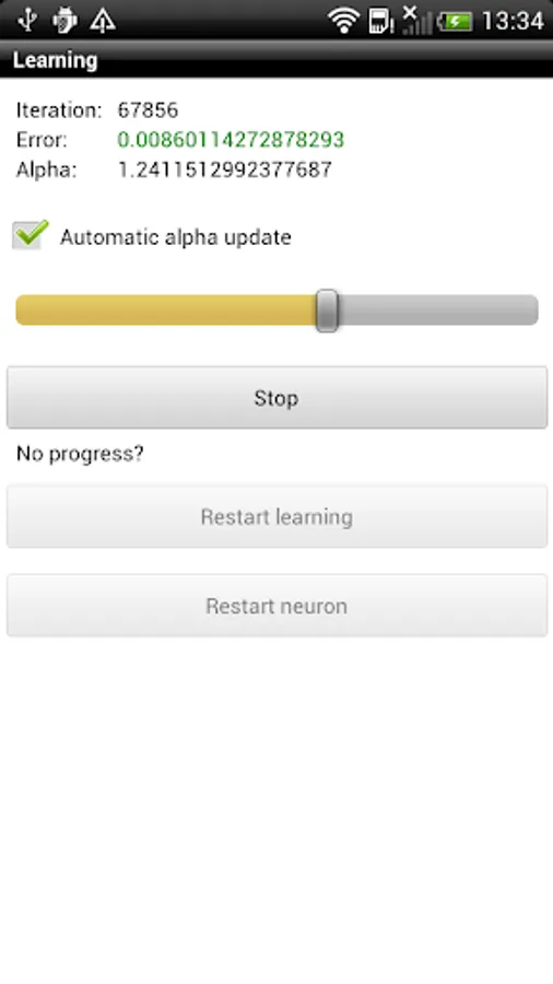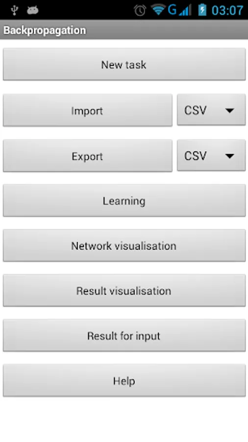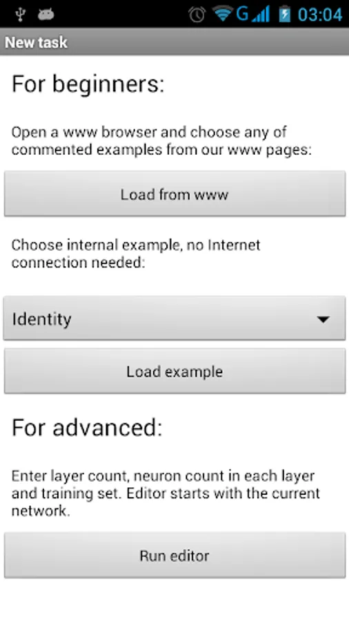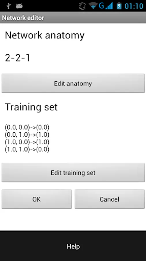 A simple example of backpropagation algorithm. Learn small neural network basic functions like predefined examples: AND, XOR or 2D distance. Import and export of custom tasks from and to xml or well readable csv. Integration with www browser. Creating new or editing loaded tasks in an editor is also possible. You can show the network anatomy and all weights and also the result with marked training set or exact output for set input. If learning failes, restart whole learning algorithm or just single neuron weights. Alpha learning speed is automatic and configurable. Help on each screen. This program may be useful for students of a basic course of artificial neural networks. It illustrates well that learning of neural networks is a complex task and basic backpropagation without any improvements can only solve very simple tasks.