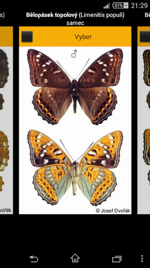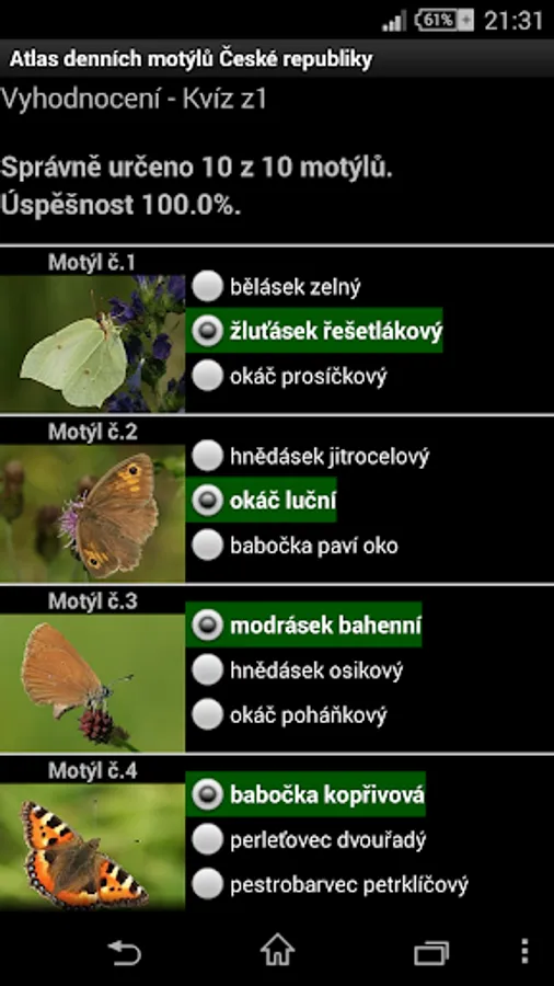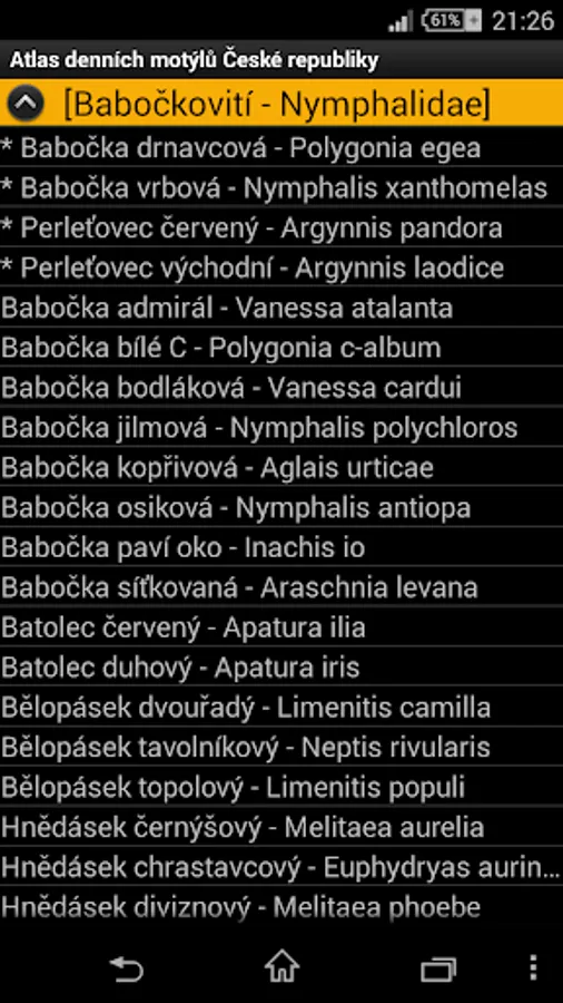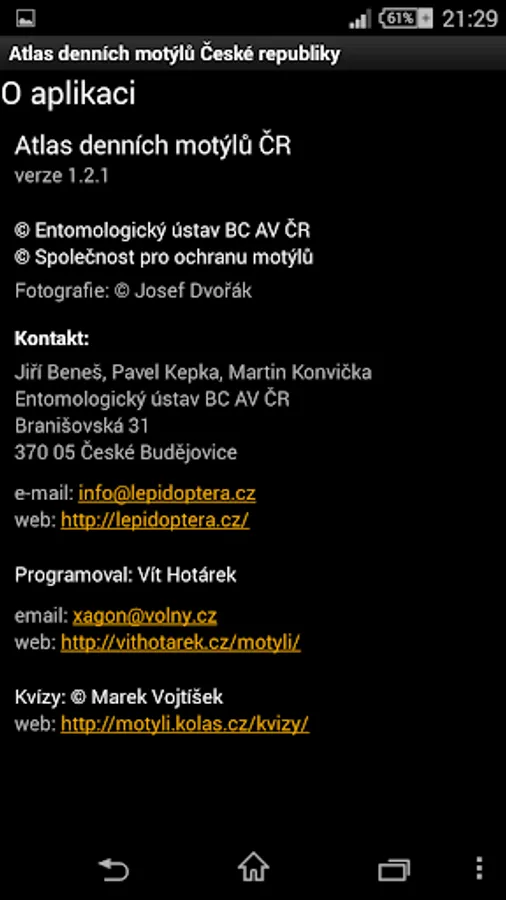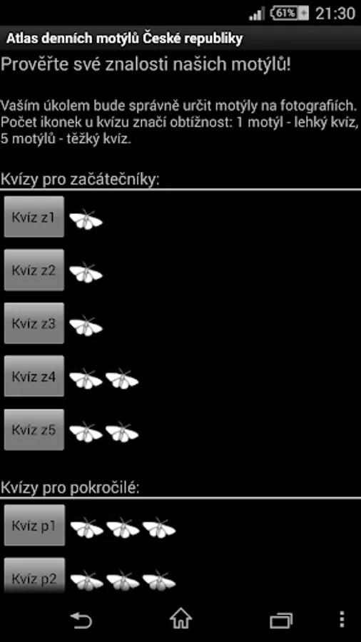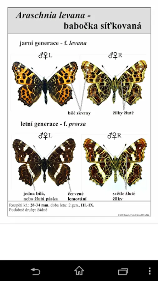 Atlas of day-flying butterflies of the Czech republic. A free offline application containing descriptions of the all czech butterflies using information from the website lepidoptera.cz made by guys from the Institute of Entomology, Biology Center under the Academy of Sciences, Czech republic. Aside from these descriptions it offers a butterfly gallery and quizes. Only in the Czech language.