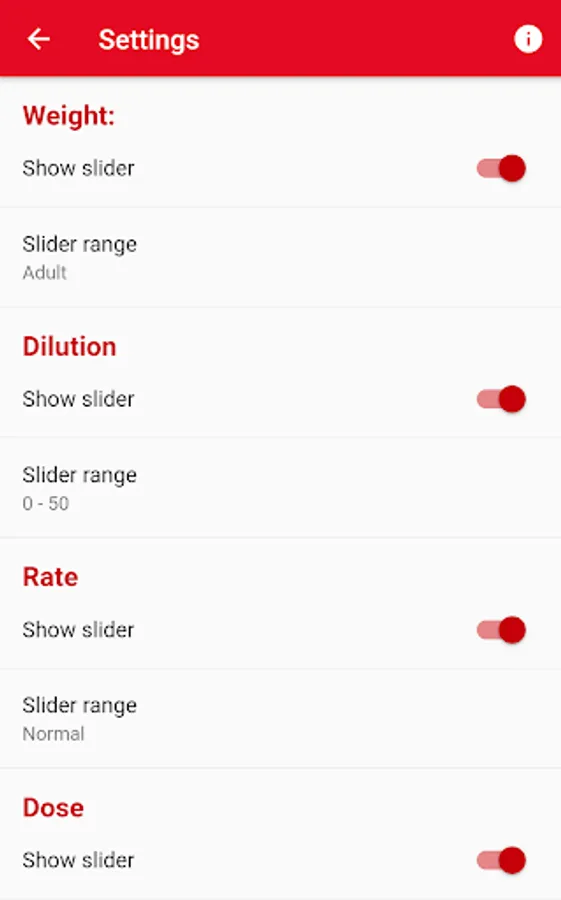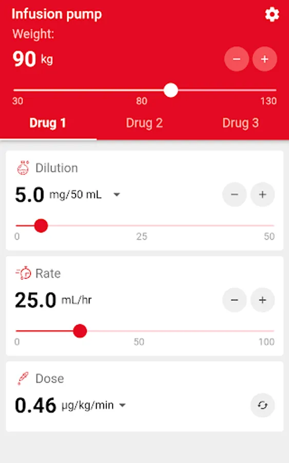You can choose from several different volumes of infusion or syringe. It also calculates the concentration of the solution.