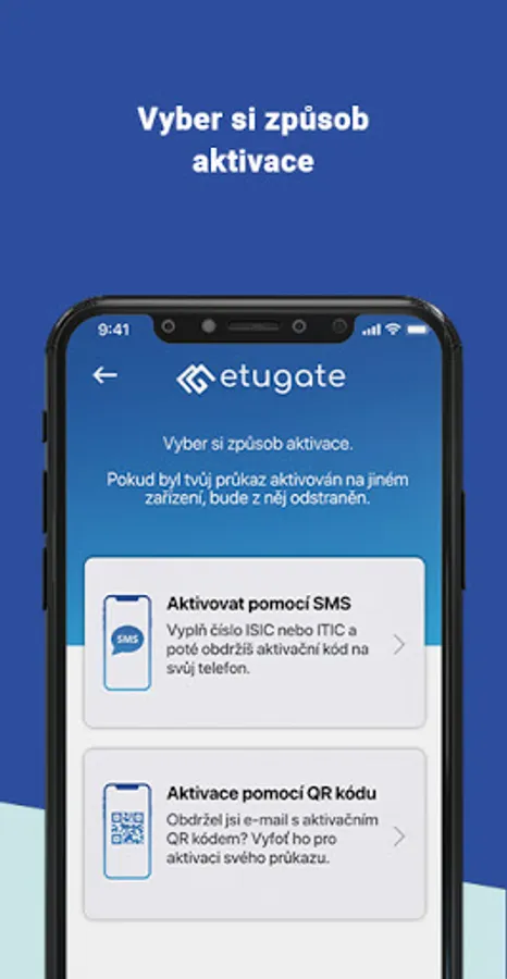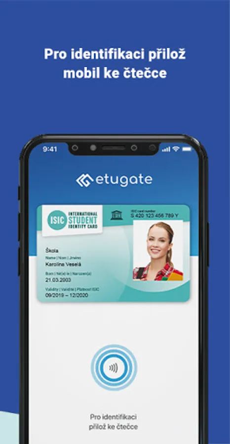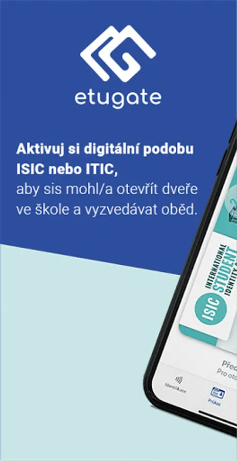 In the etugate application, you can view the digital version of your ISIC or ITIC card and thus eliminate the need for a plastic card. Using the application, you will open the door at school, pick up lunch and print everything you need. Just turn it on and attach the mobile to the reader.
