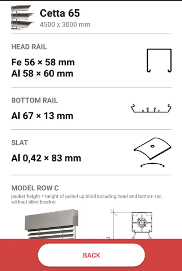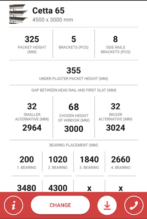 By selecting type of blind, width and height of a window, the application will calculate the packet height which will cover part of the window view-space but will also provide you an under-plaster option. Furthermore the application will calculate number of blind brackets, guiding rails and bearings placing. Smart tool for the office-use as well as for construction site.