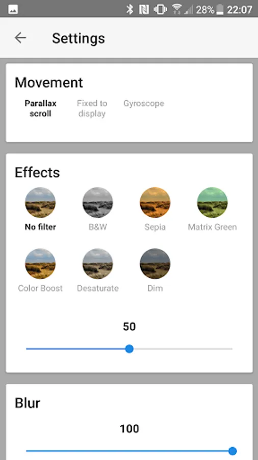 - Color filters to match your style: Black&White, Sepia, Matrix Green, Color Boost, Desaturate, Dim