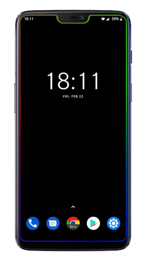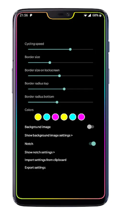 Borderlight is a live wallpaper that displays a colorful border around your screen's edges. It can be adjusted to fit any screen, with or without a notch – just open the app and change the screen shape settings. Optionally, you can add a normal background image as well (and only show it when the phone is unlocked, for example).