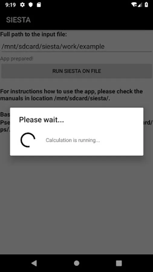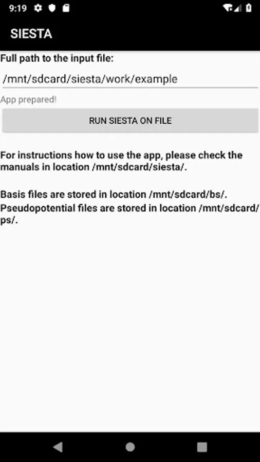 The current package contains SIESTA binaries of version 4.1 compiled for the particular Android hardware platforms and adapted for running in generic, stock devices. The app requires permission to access the file-storage. It works completely offline and does not contain ads.