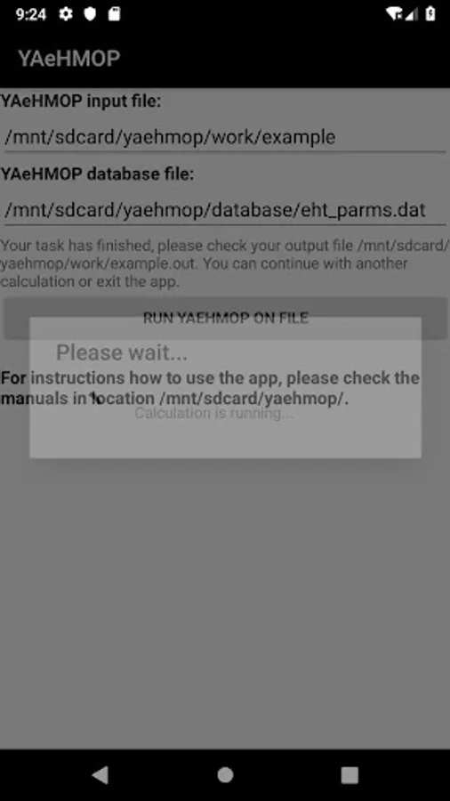 The current package contains YAeHMOP binaries of version 3.0 compiled for the particular Android hardware platforms and adapted for running in generic, stock devices. The app requires permission to access the file-storage. It works completely offline and does not contain ads.