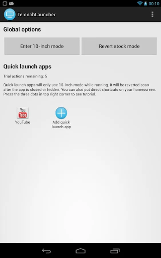 No more YouTube without related videos, no more phone-ish Play Store. All you have to do is tap the application shortcut. The display settings will be reverted as soon as the application is closed or hidden. Enjoy!
