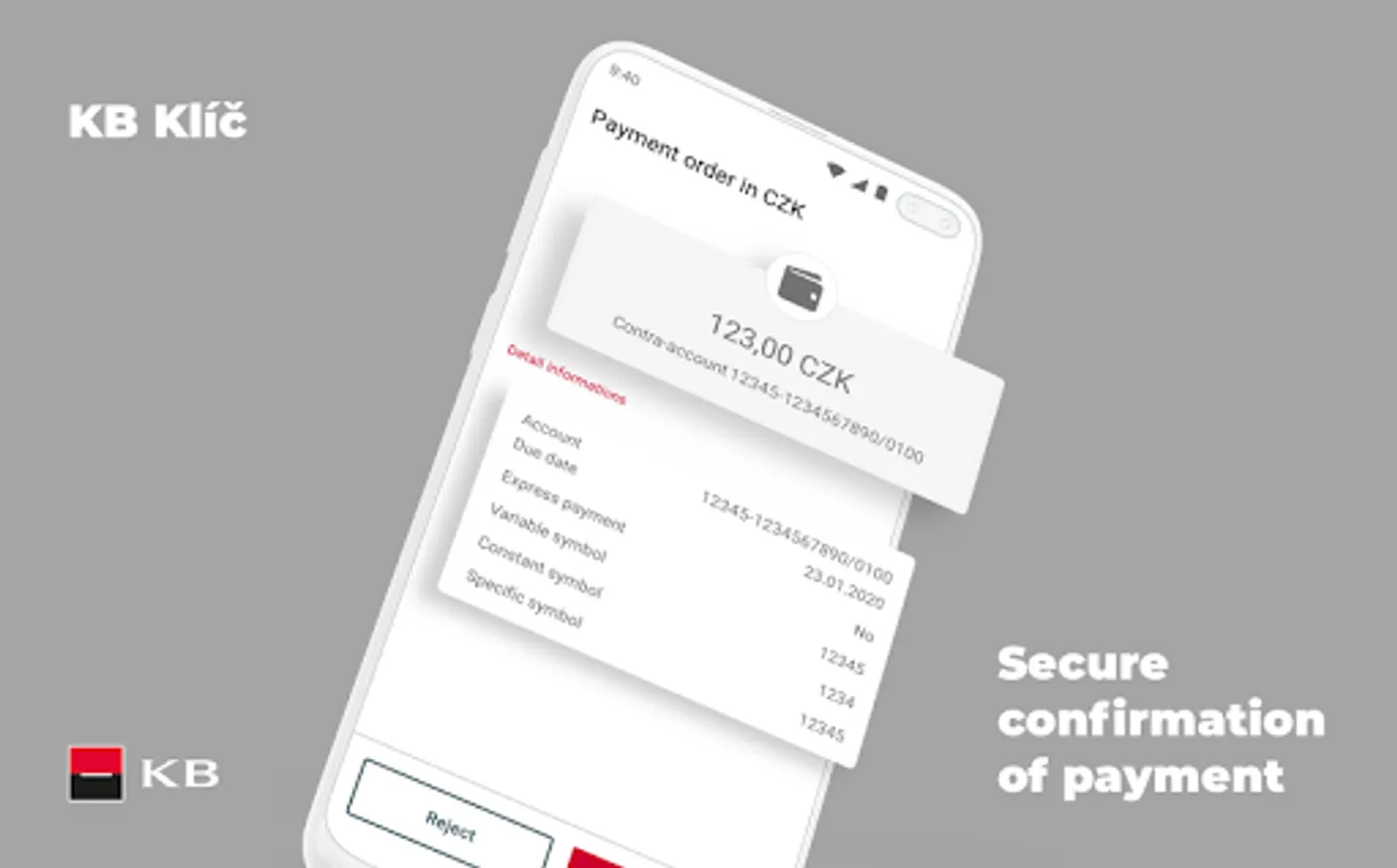 The KB Klíč app verifies your identity and safely logs you into MojeBanka online banking and Komerční banka's other online apps. You don't have to enter a texted code and you also authorise payments through the app.