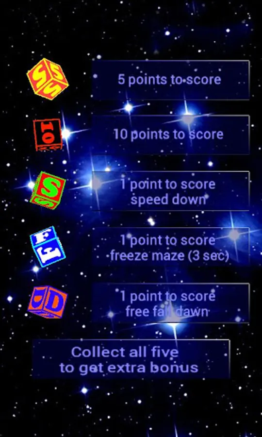 - 5 special bonuses (five and ten points, speed down, free fall down, freeze maze)