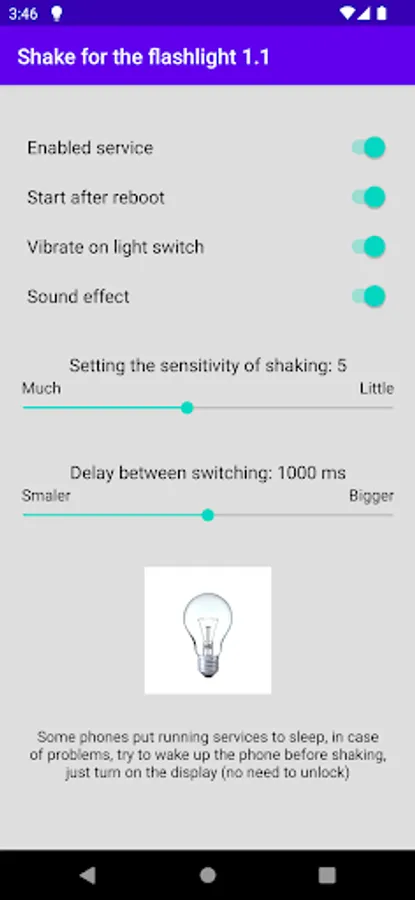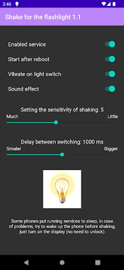 Shake for flashlight is a miniature application that allows you to easily turn on or off the led light of the camera by shaking the phone.