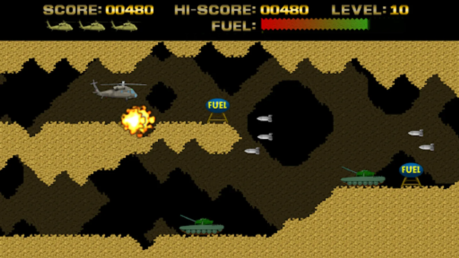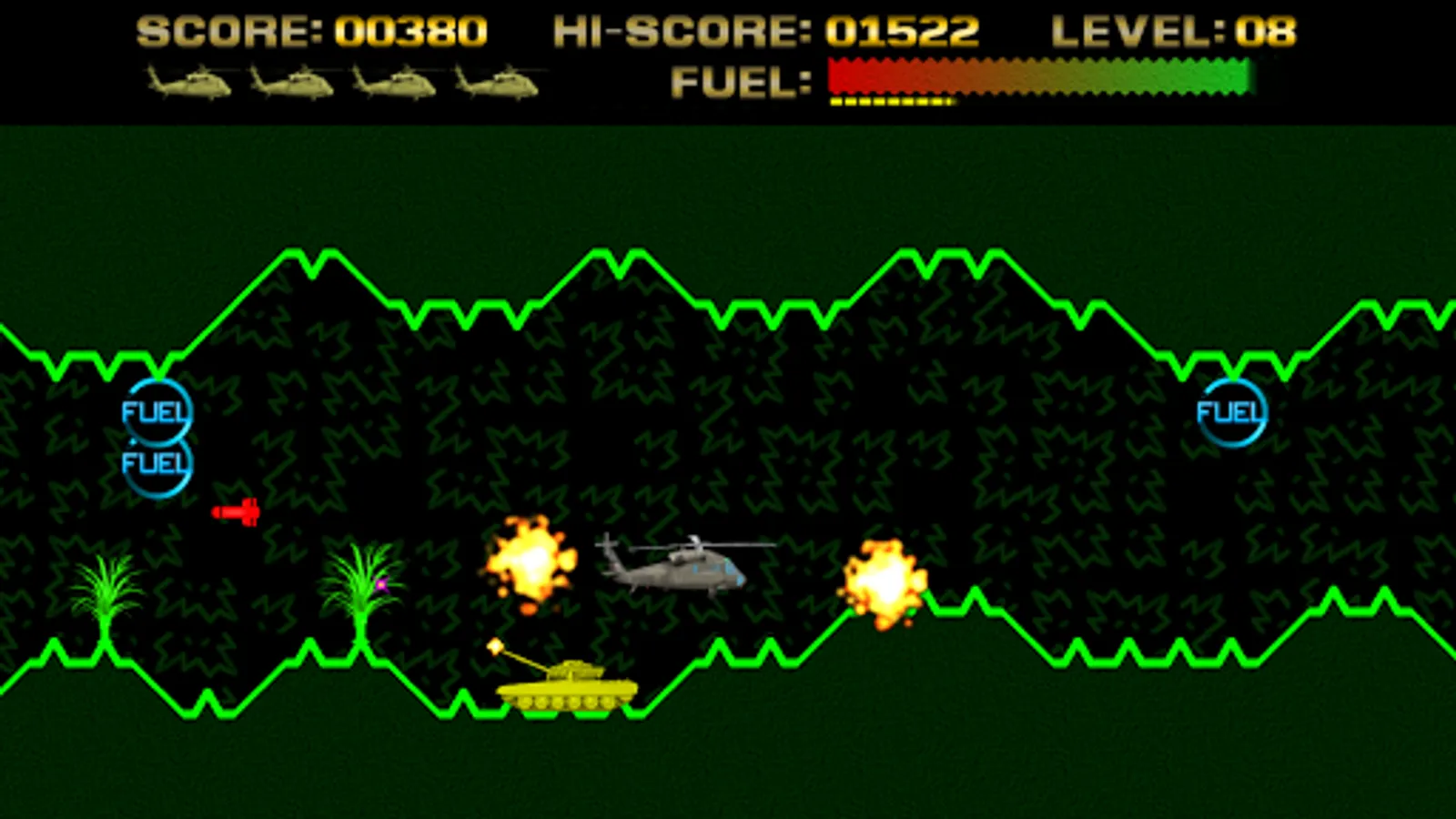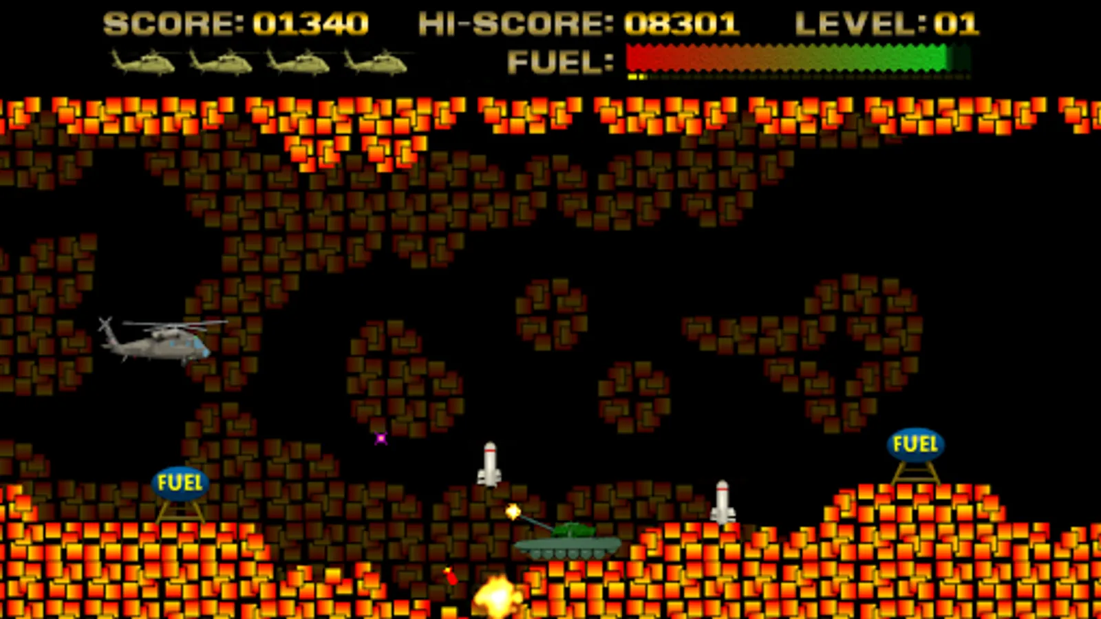 Control a helicopter and has to guide it across a scrolling terrain, battling obstacles along the way. The ship has a limited fuel supply, which is depleted over time. More fuel can be acquired by approximation fuel tanks in the game.